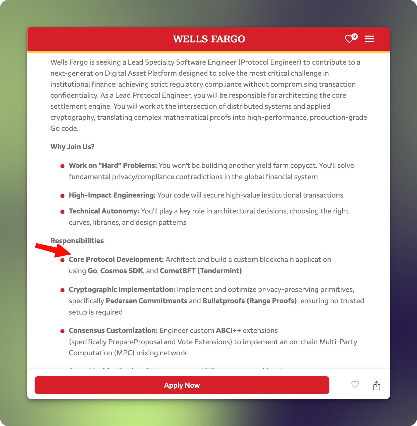 Airdrops Educator FA_Analyst D146.13K @Airdrops_oneWells Fargo is hiring to build on Cosmos SDK 👀 This is a Top-5 U.S. bank. ▫️ From the posting: “Architect and build a custom blockchain application using Go, Cosmos SDK, and CometBFT” ▫️ What @WellsFargo is actually shipping: production settlement engine for institutional assets - privacy (Bulletproofs + Pedersen), compliance view keys, custom ABCI++ MPC mixing, homomorphic encrypted balances. This is exactly the enterprise pattern we’ve been tracking: permissioned chains on the Cosmos stack for regulated flows. (Is this one of the institutional clients that @cosmoslabs_io are in discussions with?) Stack keeps winning. And the question remains the same: does any of this route through the Hub? $ATOM ⚛️ https://t.co/Guq7IDZPrr NFA. DYOR. 🫡