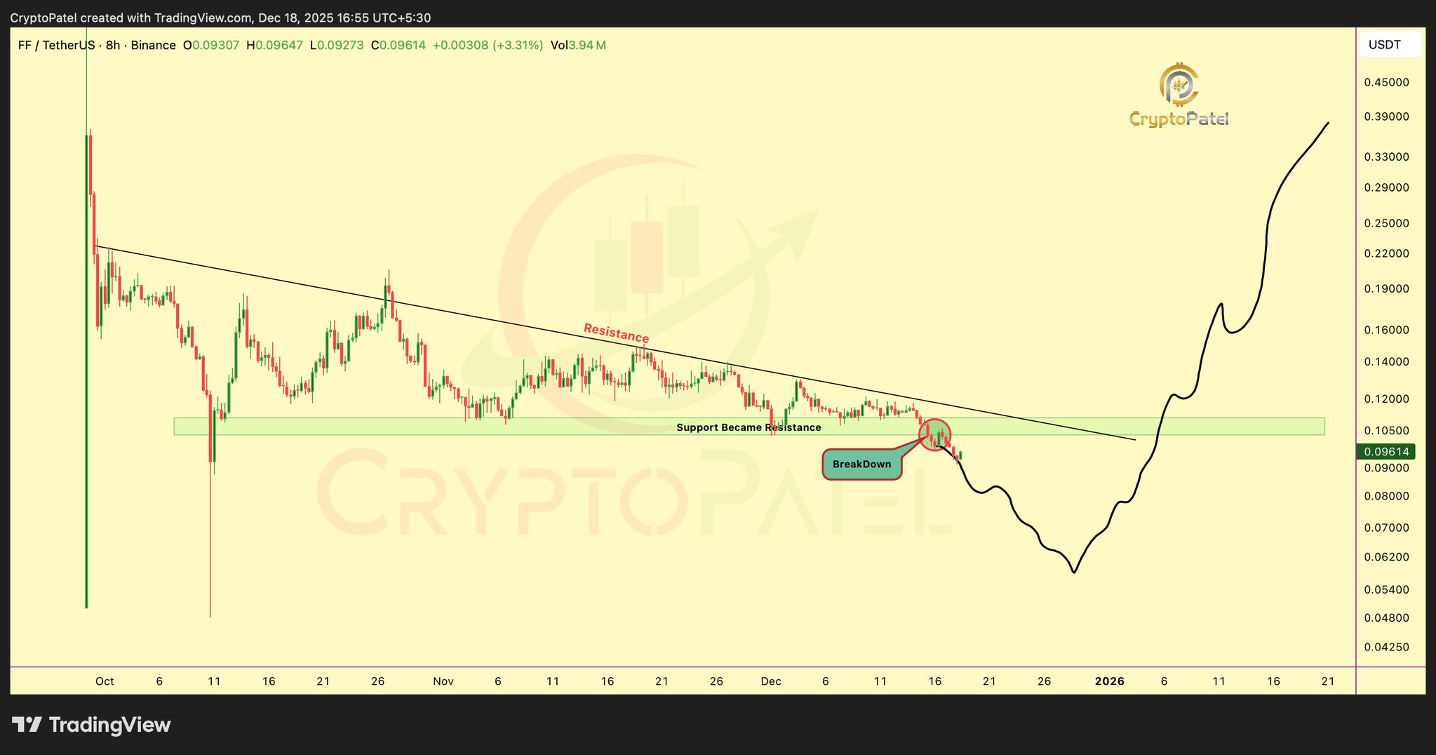 - SummaryFF price fell 3.14% to 0.091, position structure remains bearish, may drop another 20‑50% in short term, but TVL growth, 9% yield and RWA concept support long‑term potential.