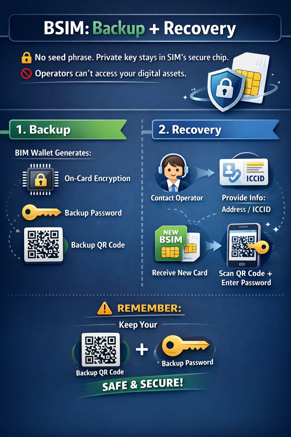 David博士 D1.65K @David6LIANG8🔐 BSIM has NO seed phrase. Your private key is derived inside the SIM’s secure hardware chip and never leaves the card. So operators don’t store your seed/private key — and can’t touch your digital assets. 🧩 BSIM replacement & restore = Backup + Recovery 1️⃣ Backup 📲 In BIM Wallet, based on: 🔒 BSIM on-card encryption algorithm 🛡️ BSIM on-card key 🔑 your own backup password ➡️ BSIM+BIM Wallet generate a backup QR code (math-based encrypted backup). 2️⃣ Recovery 📵 If your phone/card is lost: ☎️ Contact the operator support 🪪 Provide order info for identity verification: address / contact / original ICCID 📦 After you receive the new BSIM card: 📲 Open BIM Wallet 📷 Scan your saved backup QR code 🔑 Enter your backup password ✅ Restore your asset account into the new BSIM. ⚠️ Important Reminder: Keep your backup password + backup QR code safe. #BSIM #Conflux