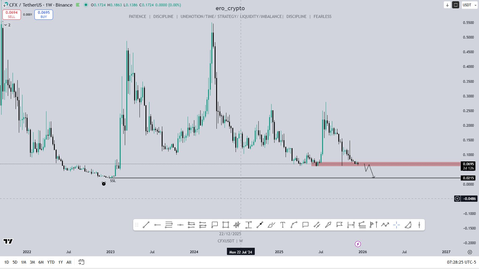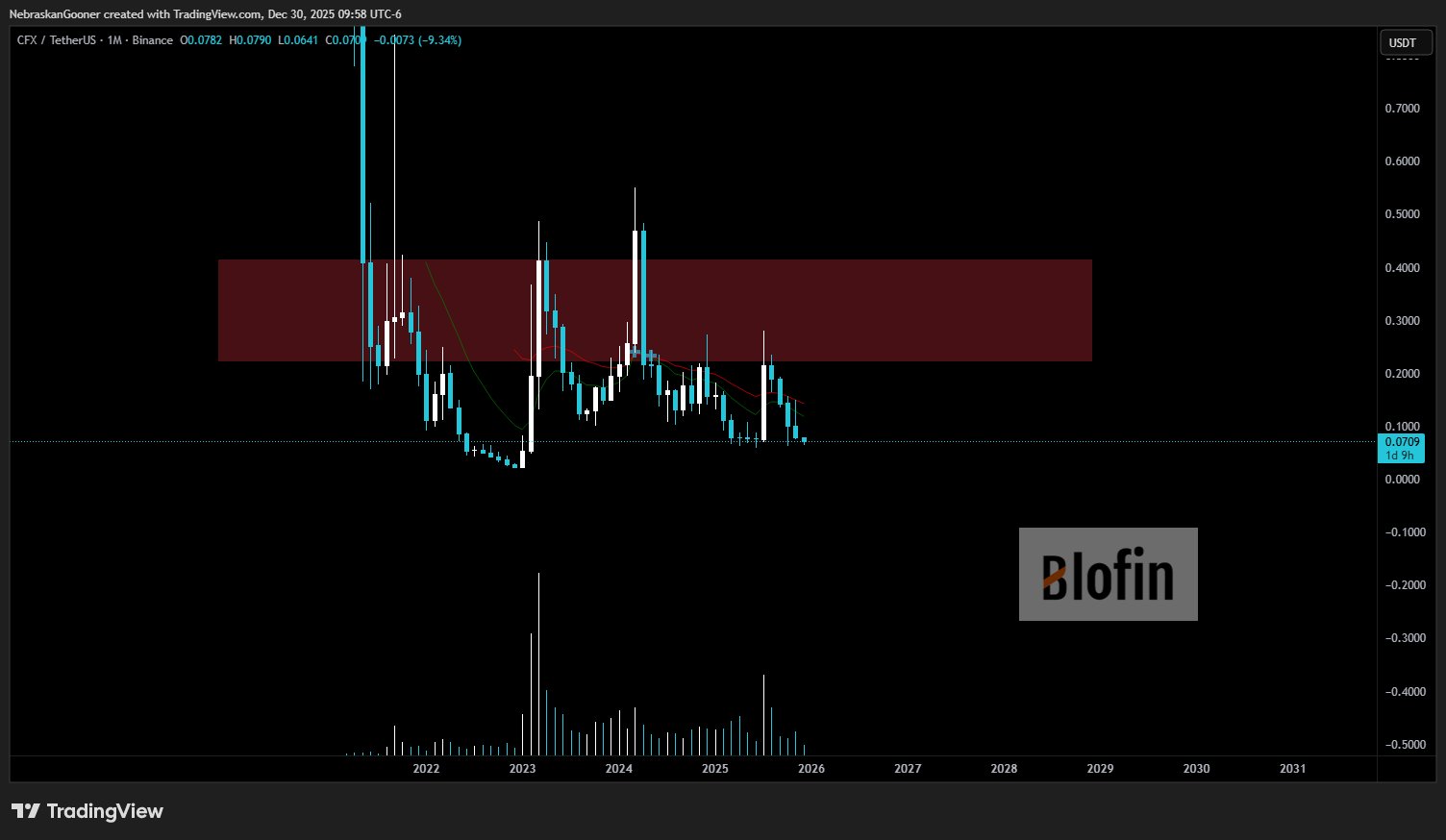 22 8 5.60K أصلي >اتجاه CFX بعد الإصدارهابط بشدةCFX is referred to by the author as a “dead altcoin”, and the chart shows its price has been low for a long time and recently dropped.