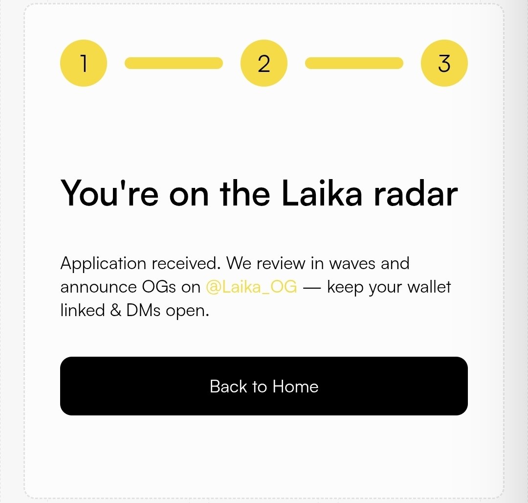 The tweet is bullish on the future value of Laika superDApp, and the image shows that the application has been successfully submitted and entered the Laika radar.
