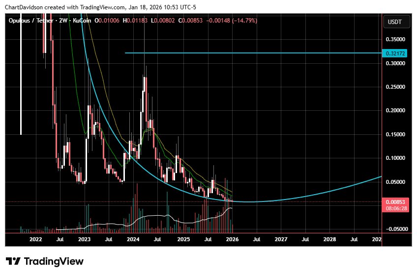 The tweet author believes OPUL may have a 32x upside potential and shows its long-term chart.