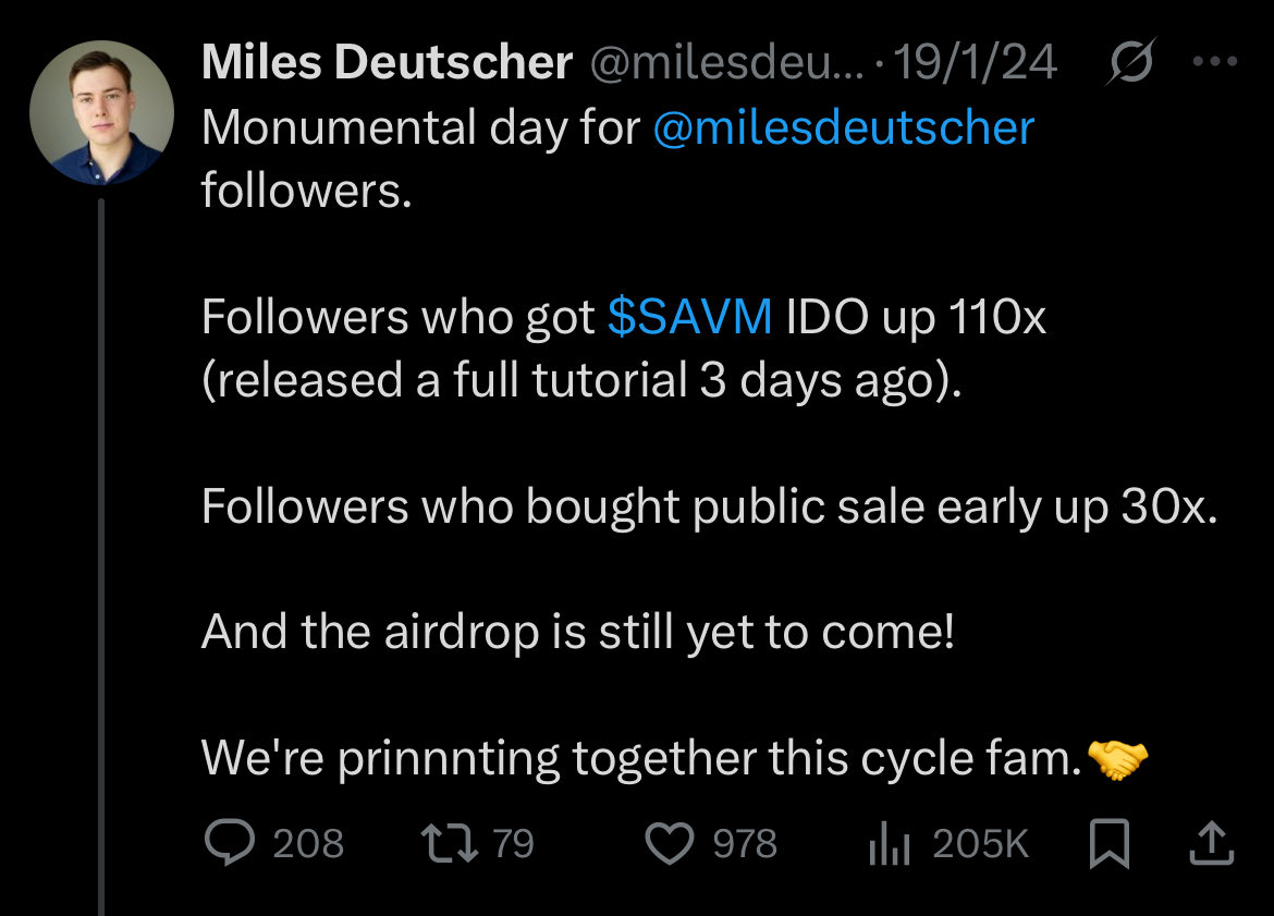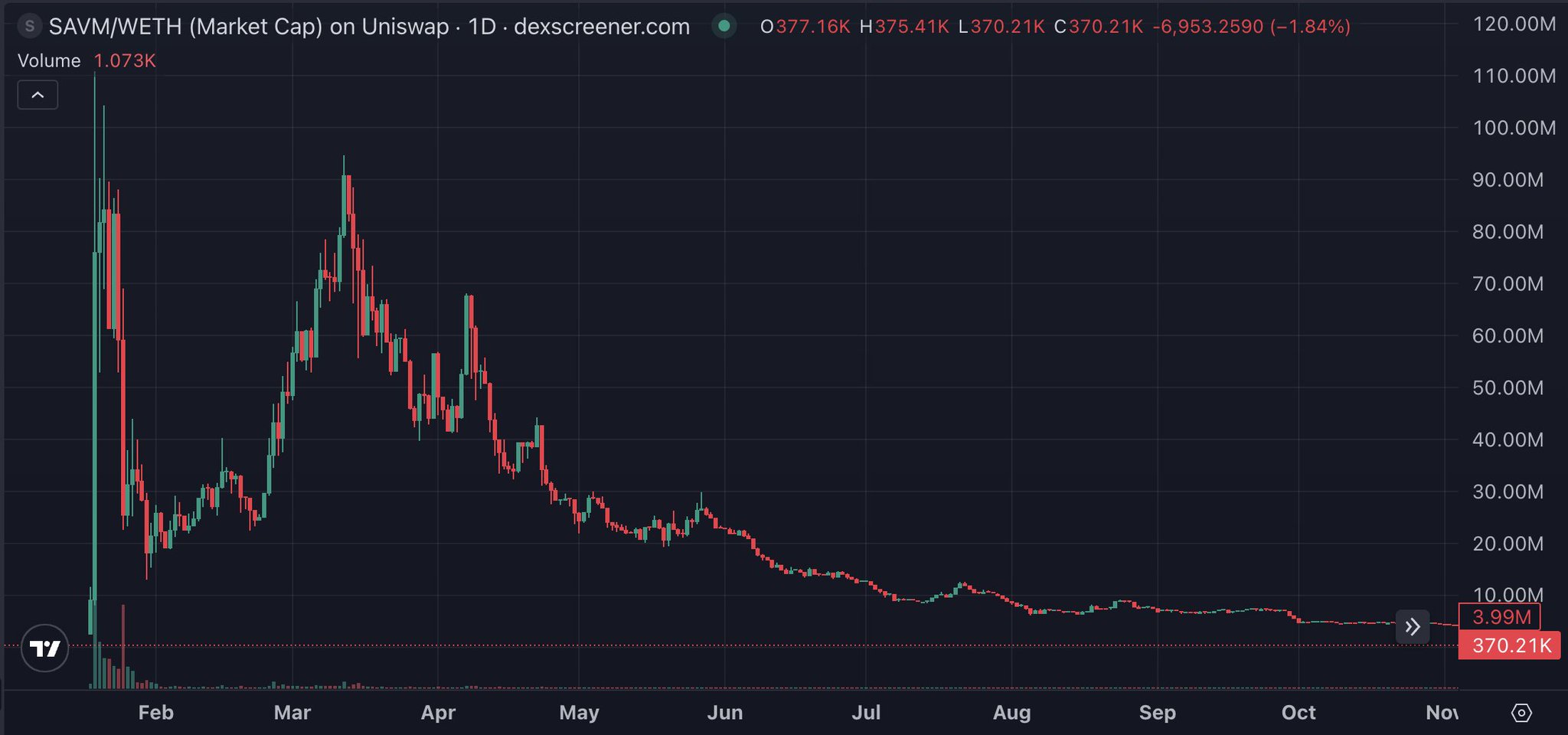 The tweet questions whether SAVM promoters profited from shilling, while the coin's price has plummeted by 88% after an early surge.