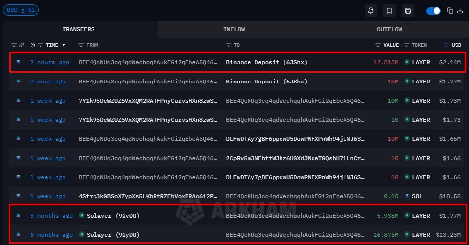 Less than 20 minutes ago, $LAYER tokens worth $3M were transferred to Binance