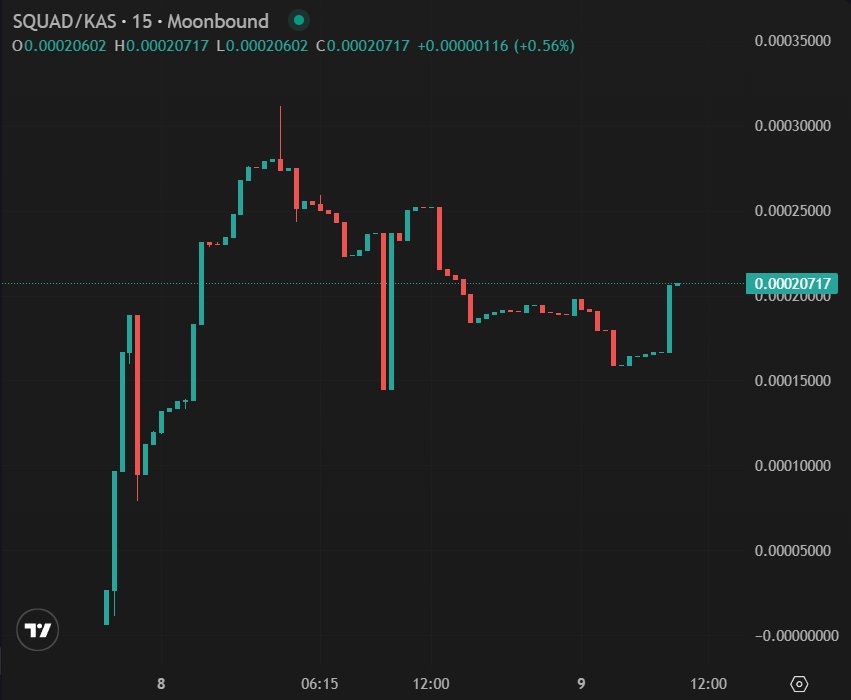 The tweet is bullish on SQUAD coin, and the image shows its recent price rebound in the KAS pair, suggesting not to short.