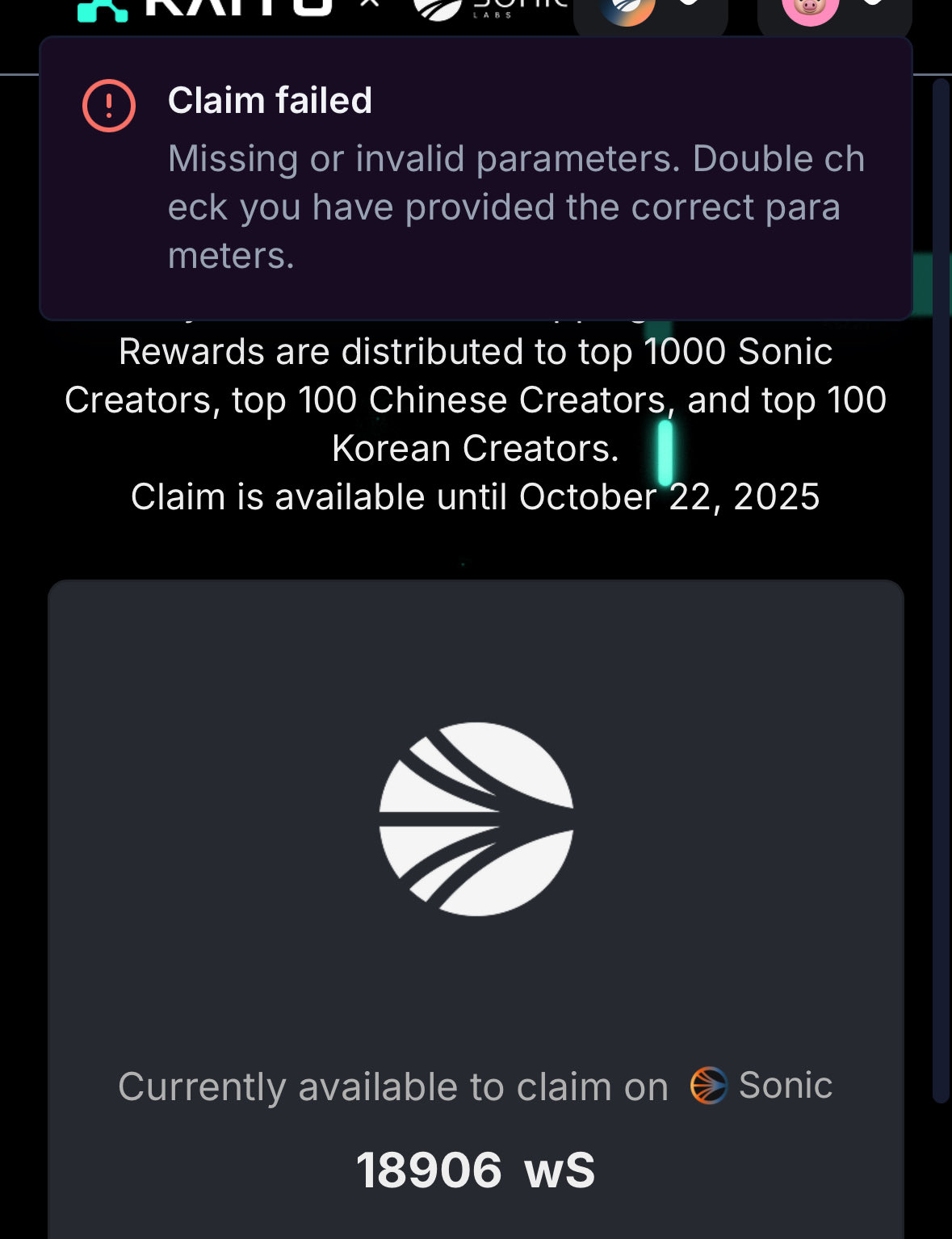 The user encountered a 'Claim failed' error when trying to claim rewards on the Sonic platform. It was later discovered that the issue was due to insufficient on-chain 'gas fees', and the problem has since been resolved.