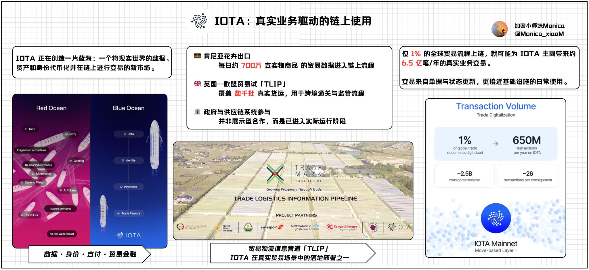 加密小师妹|Monica Educator DeFi_Expert C147.21K @Monica_xiaoMAfter several narrative shifts, discussions about public chains seem increasingly “data‑only.” Reviewing the market recently, I increasingly feel that when we evaluate public‑chain value we overly rely on a single metric: capital flow. TVL, DEX trading volume are certainly important, but the problem is obvious. In this market, capital has almost no loyalty; it moves wherever returns are slightly higher. Such booms come fast and go fast. This makes me wonder, in a relatively mature cycle like 2026, whether there are other lenses that can reflect a chain’s long‑term survivability. A simple business concept I’ve been leaning toward lately: switching cost. If a chain only offers an alternative trading or investment option, it is essentially interchangeable. But when it is embedded into real‑world business processes, especially cross‑border trade, logistics, or administrative systems, the situation is entirely different. The recent strategic report from @iota appeared on my timeline, sparking a lot of discussion in the English‑speaking community. Several concrete numbers caught my eye: - In Kenya, data related to flower exports covers roughly 7 million physical items per day and has entered a stable on‑chain processing workflow. - In the UK, a trade pilot with the EU has already covered thousands of real shipments, with data used in actual cross‑border customs and regulatory procedures, providing border agencies with a visual record of goods movement. These are not just “showcase” collaborations like issuing a statement or an NFT. For governments or large supply‑chain players, replacing such a foundational system means re‑integrating processes, retraining staff, and undergoing compliance reviews again. That cost itself forms a moat. Another point that interests me is how these real‑world activities translate into on‑chain behavior. According to publicly available IOTA data, a single shipment generates about 26 on‑chain transactions on average, including document uploads, status updates, etc. If we scale this model, digitizing merely 1 % of global trade processes could generate roughly 650 million non‑speculative transactions per year on the IOTA mainnet. These transactions are stable, repeatable, and unavoidable. $IOTA fees are burned at the protocol level, introducing deflationary pressure and acting more like an infrastructure usage fee. At the same time, tokenizing trade documents and assets requires locking tokens as storage or existence guarantees; as long as the business continues, those $IOTA tokens cannot exit circulation. Putting these points together reveals an interesting phenomenon: When the business itself has high switching costs and the on‑chain mechanism turns usage into continuous consumption and locking, the chain’s value source no longer depends solely on market sentiment. A steady flow doesn’t fight to be first; it fights to be relentless. By 2030, the amount of capital operating on blockchains each year is expected to exceed $393 billion. But the market won’t pay for every hype; most blockchain networks lacking clear objectives, unique value propositions, and real use‑cases will ultimately be weeded out by the real world.
