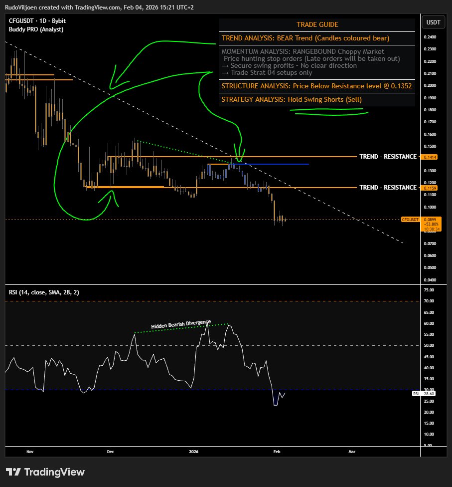 CFG is in a bearish trend, price below resistance, recommend holding short positions.