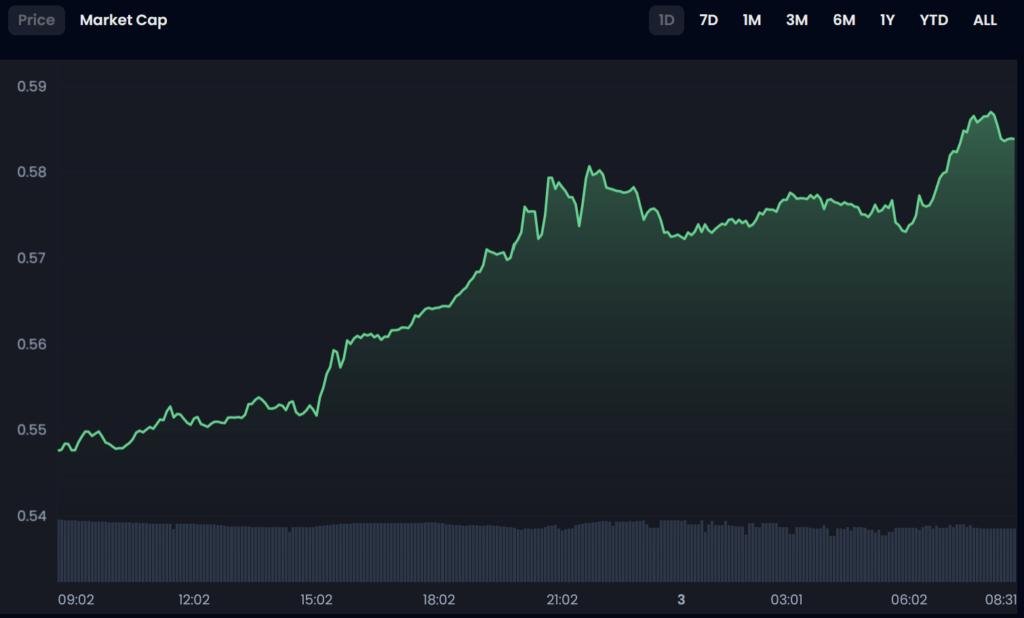 → $BAR jumped 7% in 24 hours, moving from 0.547 to 0.586.