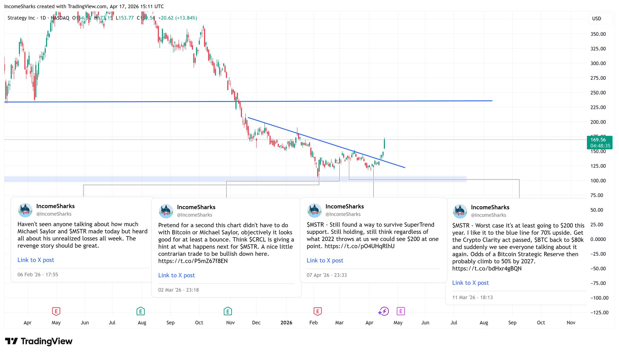 The author’s MSTR position gained 47%, entry prices $108 and $125.