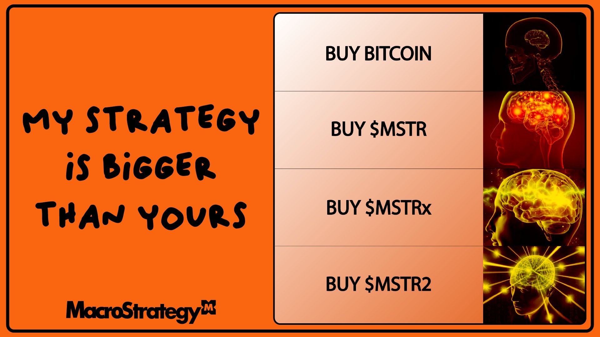 The tweet introduces the first stockcoin $MSTRx, and the image suggests buying Bitcoin, $MSTR, $MSTRx, and $MSTR2.
