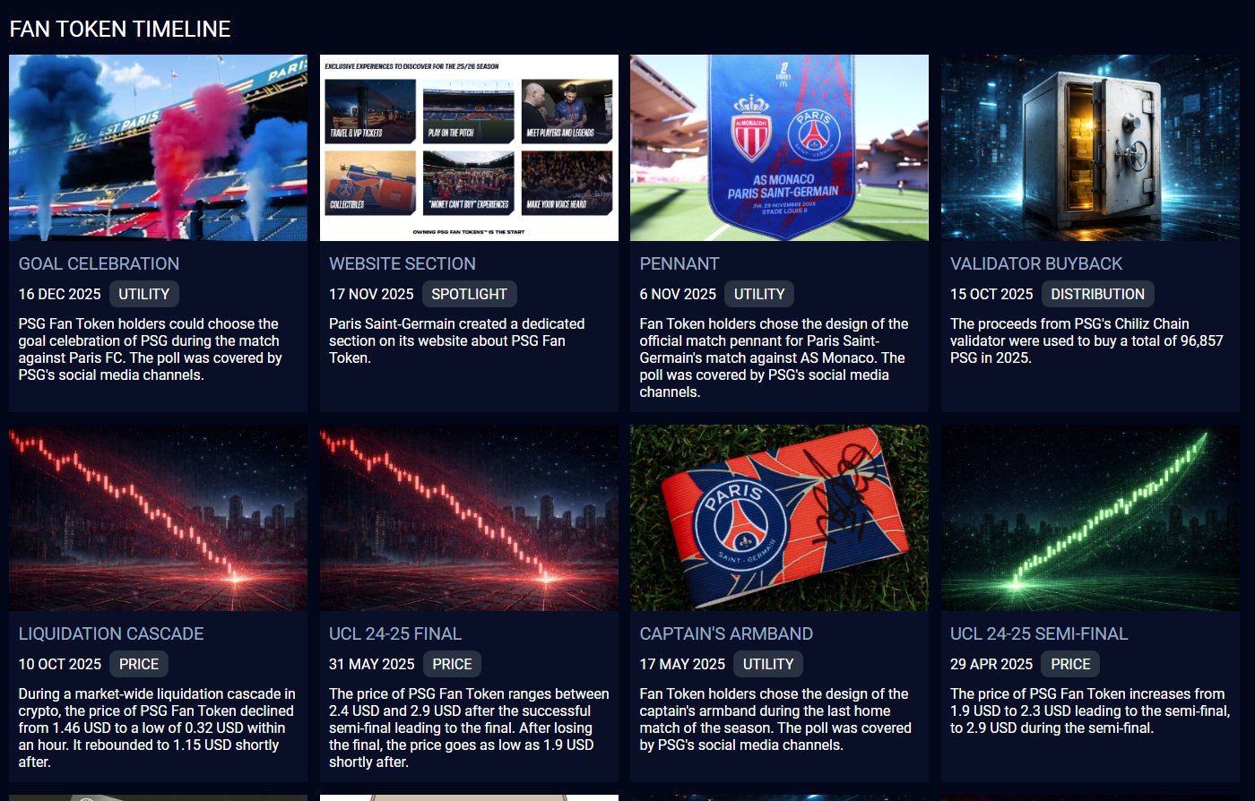 🆕 Introducing the Fan Token Timeline! It shows you all major events of a Fan Token, such as utility examples, price movements, mainstream coverage, NFTs, distribution events, and more! This is a new feature on Rocketfan, currently live for $PSG only.