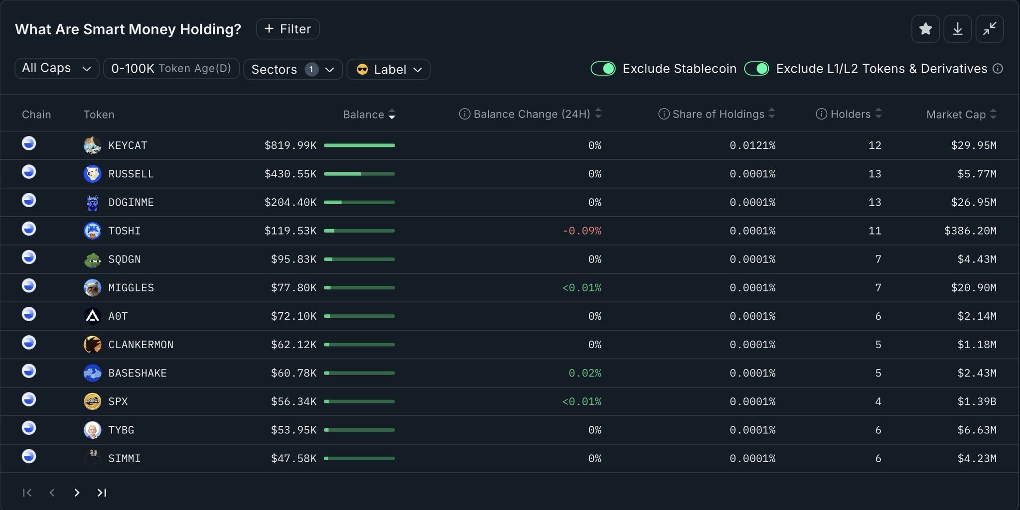 Nansen data shows the distribution of smart money holdings in Base chain memecoins, with $KEYCAT and $RUSSELL being the main focus.