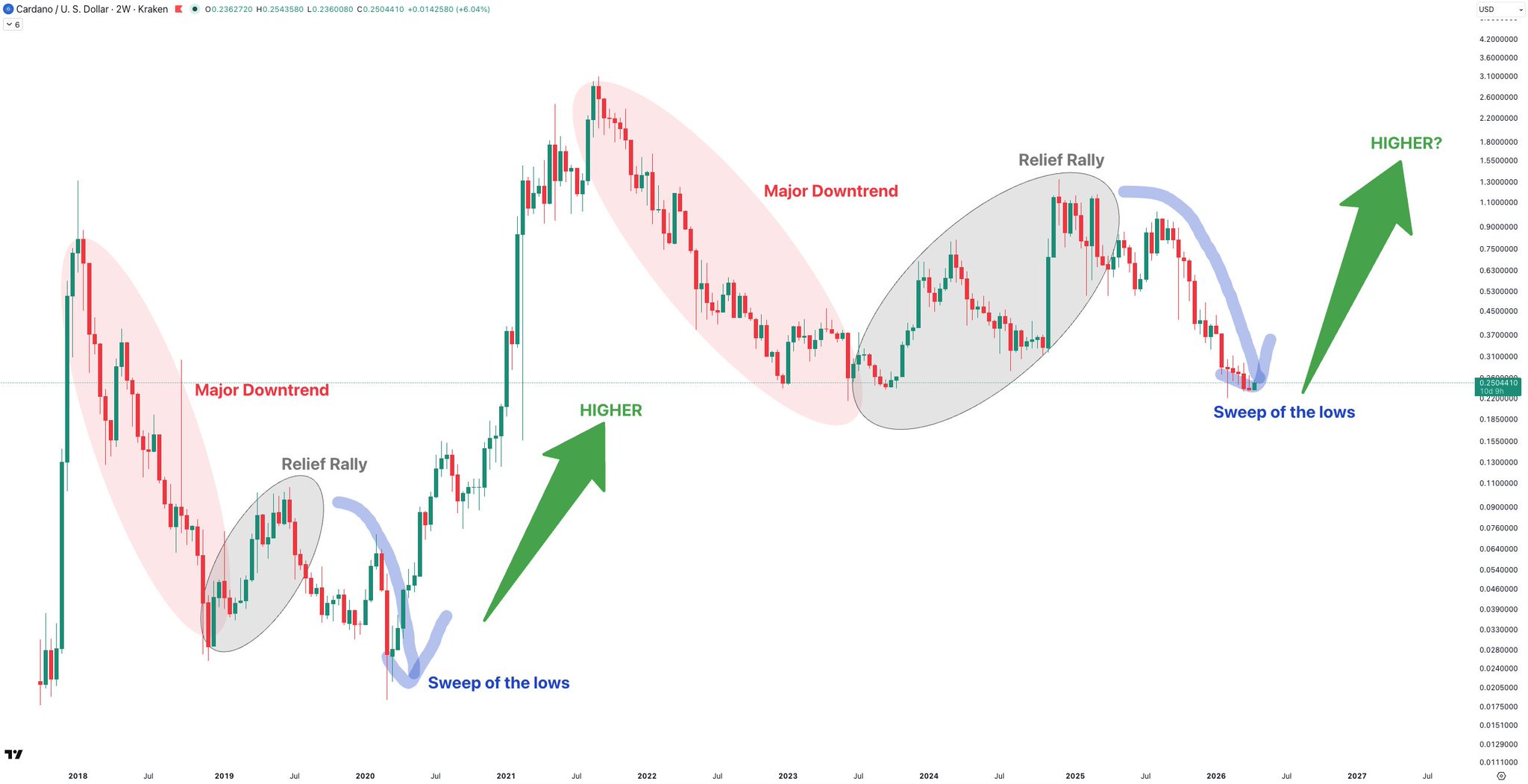 ADA当前价格可能处于周期性低点,预示着类似历史走势的强劲上涨机会。