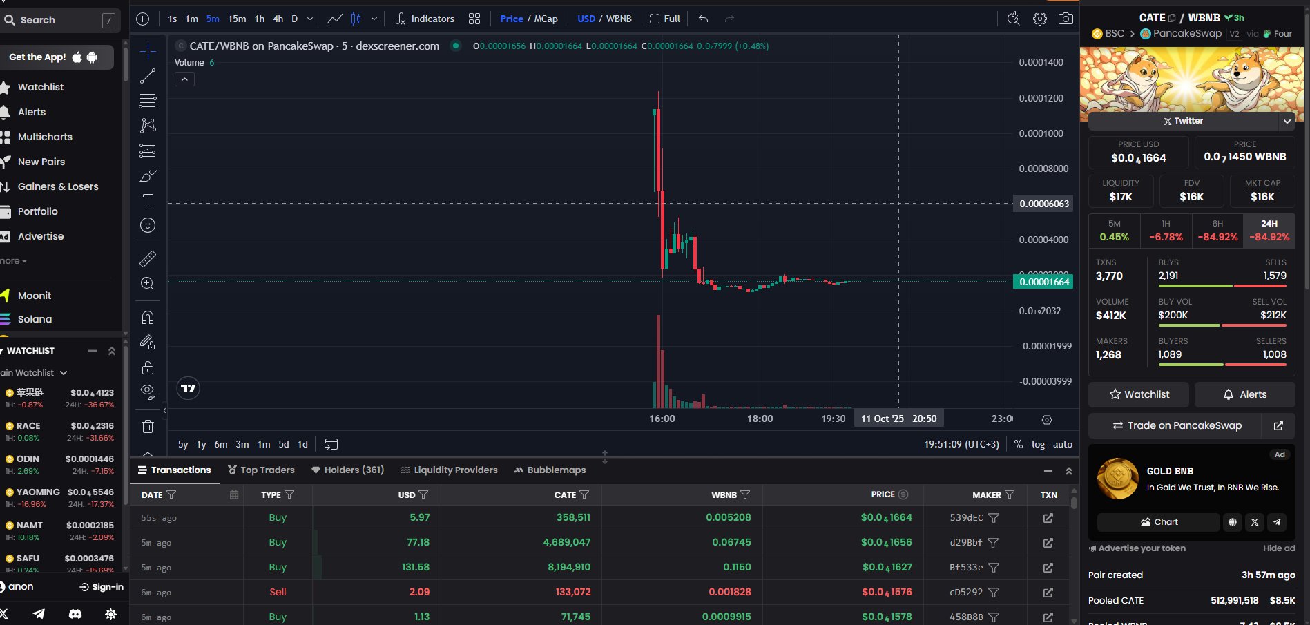 The tweet author expresses uncertainty about CATE coin's price trend. The attached image shows the coin plummeted nearly 85% within 24 hours, with extremely low liquidity and huge risk.