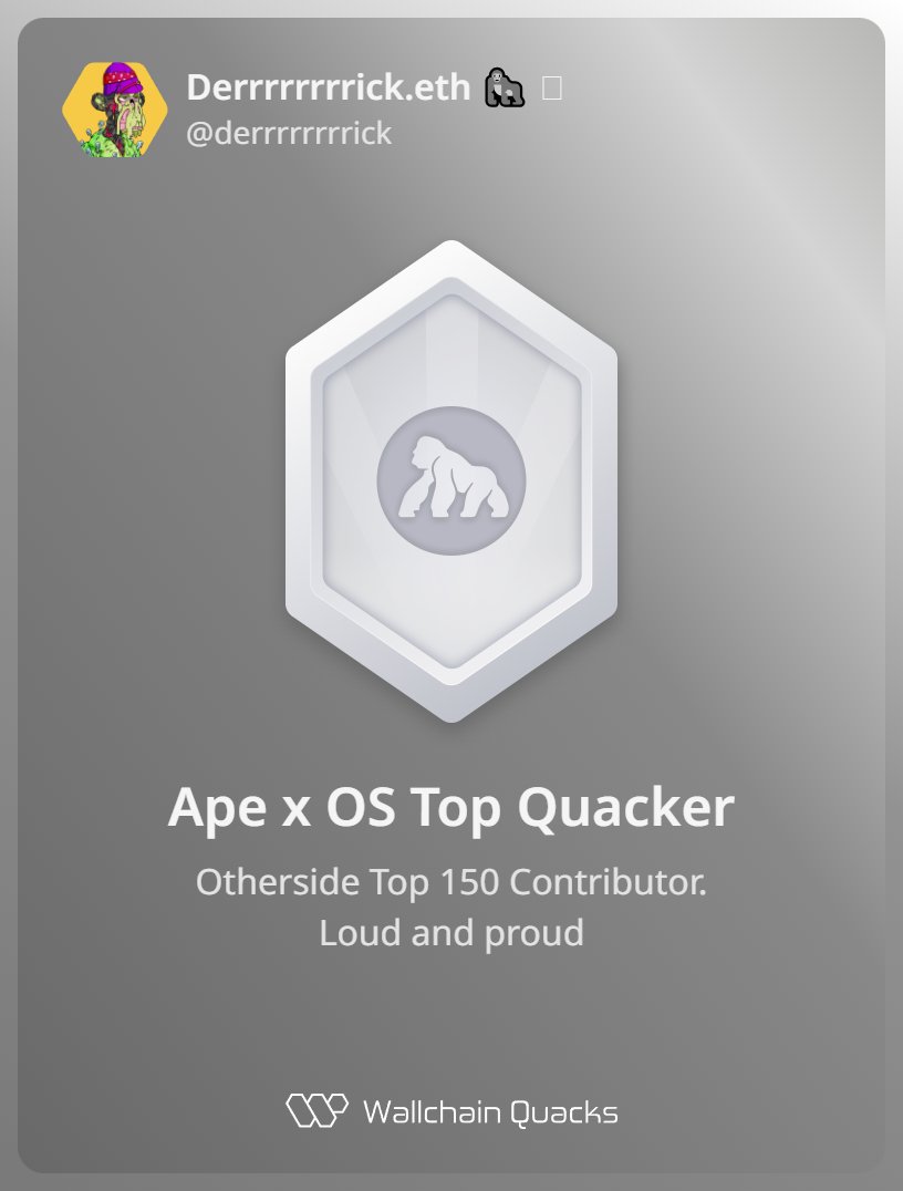 Derrrrrrrrick.eth 🦍 🪞 D1.83K @derrrrrrrrickAnother badge to add to the list. Just unlocked the Ape x OS Top Quacker on @wallchain 🏆 How cool is that? Feels great to have my contributions recognized. How’s Wallchain Quacks been treating you so far? Not on board yet? Drop a comment for an invite 👇🦆 https://t.co/0rja1wThuh