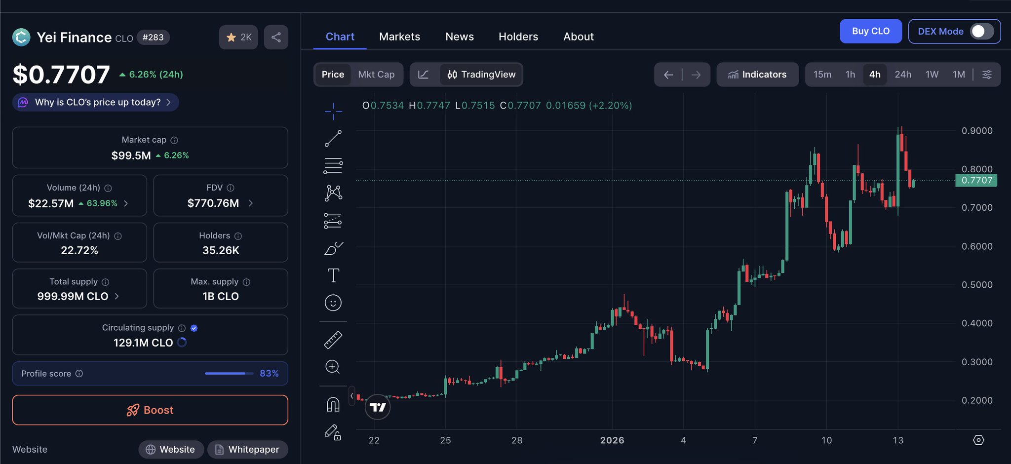 - SSI Trend (7D)Price (7D)Sentiment DistributionExtremely Bullish (14%)Bullish (86%)SSI InsightsCLO social hotness high (80.68/100, unchanged), activity 31.61/40, positive sentiment 28.57/30, KOL attention 20.5/30, driven by 164% 30‑day increase and Sei ecosystem boost.