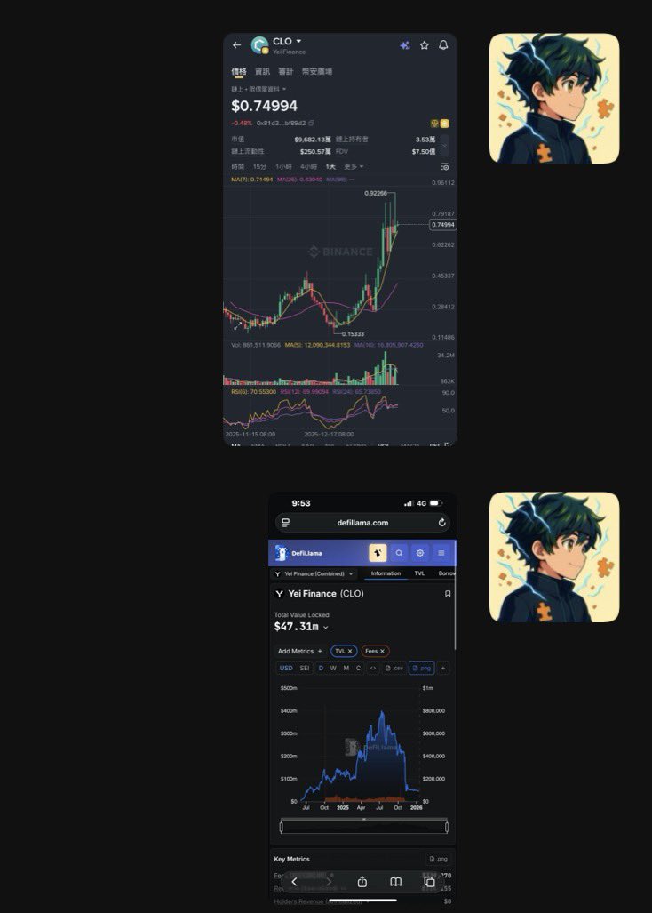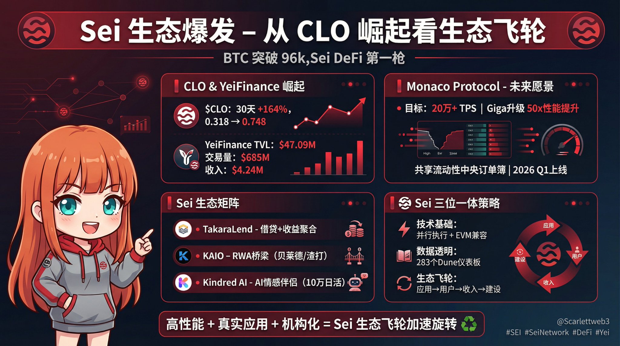 Jingle Bell 初号机 OnChain_Analyst Community_Lead S39.02K @ScarlettWeb3Bull market returns, quick rally. As BTC broke through 96k this morning The best-performing token in my watchlist is: $CLO (Sei ecosystem) 30 days 164%, climbing from 0.318 to 0.748, peaking at 0.91 $CLO is the governance token of @YeiFinance and YeiFinance is one of the most important DeFi protocols on @SeiNetwork 1⃣ Will the rise of $CLO be the first shot of Sei DeFi explosion? 🔫 The first model has always emphasized to everyone: Altcoins are not unbuyable, but you should buy projects that can be profitable Project teams, VCs, and retail investors come into the crypto space to make money. If a project team cannot make money through the project itself, then, while protecting its own interests, the team will act maliciously, sprinkling tokens to you in exchange for its own exit liquidity $CLO is the core economic token of Yei Finance, one of the largest DeFi protocols on Sei Yei protocol TVL is $47.09 million, cumulative trading volume exceeds $685 million Cumulative revenue is $4.24 million, fully capable of generating real protocol income 💰 For the Sei ecosystem, the impressive performance of $CLO means: ▪️ Capital and trading activity on Sei ▪️ On-chain user participation and asset liquidity ▪️ Recognition from researchers and mainstream investors for Sei YeiFinance's success proves that Sei's technical advantages (400ms finality, parallel execution) can be turned into real user value (or reflected in the token price ~ 🙃 But Sei's ambition and core battlefield are not limited to this; it has always been high-frequency trading 2⃣ Sei ecosystem has many great projects 🏆 👉 @MonacoProtocol 👈 Because if YeiFinance is the “present tense” of the Sei ecosystem, then Monaco Protocol may be the “future tense” — it represents Sei's ultimate vision in the high-frequency trading field Monaco Protocol is a shared liquidity central order book trading layer incubated by @Sei_Labs, built specifically for the Sei network In simple terms, it aims to: Bring the speed advantage of traditional centralized exchanges (the millisecond-level matching of Binance, OKX) into the decentralized world Monaco will directly leverage Sei's Giga upgrade (50x EVM performance boost), targeting over 200,000 TPS. If this is moved to decentralization, handling Hype's volume is not impossible 🤪 The future shape of the Sei ecosystem will likely be: ▪️ YeiFinance providing lending + spot trading ▪️ Monaco filling high-frequency derivatives and orderbook spot Monaco is currently in the pre‑mainnet stage (expected launch Q1 2026), but has already passed RFP
