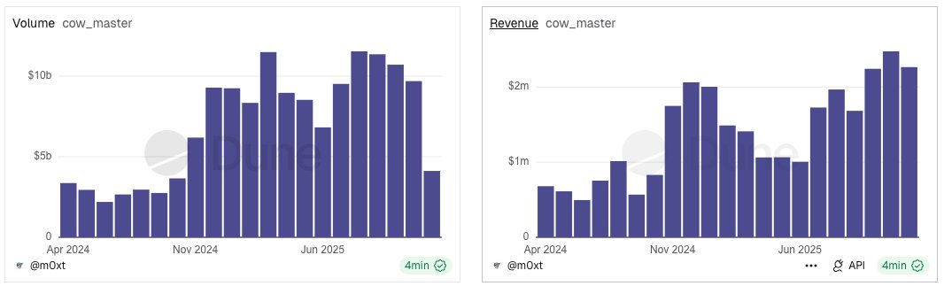 m0xt D1.98K @m0xt_December marked the second-highest revenue month for @CoWSwap, despite a significant decline in trading volume. At first glance, this divergence might seem concerning but the trend is consistent with broader DEX activity, which also saw volume contraction during the month. The improved efficiency, reflected in a take rate of 0.055%, stems from the recent introduction of volume-based fees. It means Cow is now able to capture more revenue per dollar traded, improving overall monetization. However, some adjustments to the current fee structure may be necessary to retain existing users and prevent potential drop-off.
