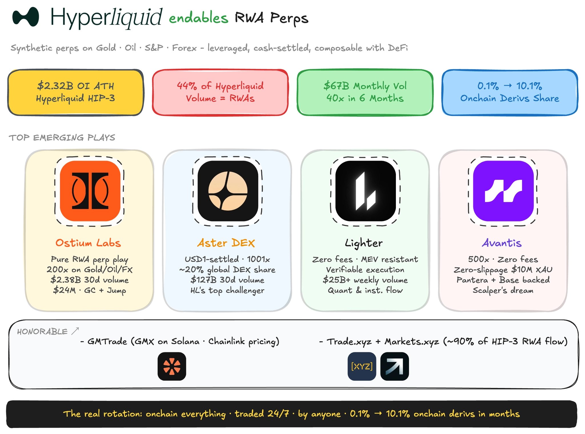 - RWAs have been making up as much as 44% of Hyperliquid’s total volume in recent weeks → A single perp DEX is routing nearly half its flow through traditional asset exposures