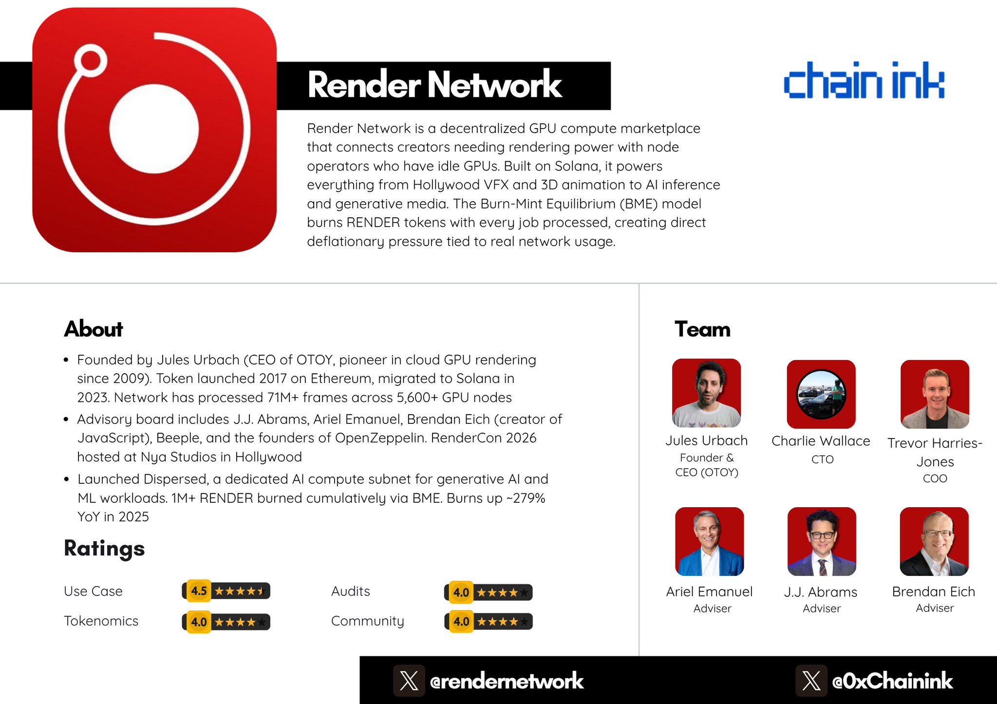 $RENDER : Review 📜 What if every idle GPU on the planet could be put to work rendering Hollywood movies, training AI models, and building the metaverse, and the people who own those GPUs got paid for it? Meet Render Network - a decentralized GPU compute marketplace built on Solana that connects creators with idle GPU power, processing 71 million+ frames for studios, artists, and AI developers. Advised by J.J. Abrams, Brendan Eich, and Beeple. Where GPU power becomes a tokenized commodity. Let's explore how Render is decentralizing the future of compute. 👇 ⚪ Render at a Glance Render Network is a peer-to-peer GPU compute marketplace created by Jules Urbach, founder and CEO of OTOY, the company behind the industry-standard OctaneRender engine. The network connects creators who need GPU power with node operators who have idle capacity, creating a decentralized alternative to centralized cloud rendering. The $RENDER token powers the entire marketplace. Creators pay in RENDER (or fiat, which is converted and burned), node operators earn RENDER for completing jobs, and the Burn-Mint Equilibrium model permanently removes tokens from circulation with every job processed. As of April 2026, $RENDER trades around $2.07 with a market cap of approximately $1B. Max supply is 644.2M RENDER, with ~552M in circulation. The network has processed 71M+ cumulative frames across 5,600+ GPU nodes, with 1.2M+ RENDER burned cumulatively. Marketplace Insight: The RNP-023 governance vote to integrate Salad's ~60,000 consumer-grade GPUs as an exclusive subnet could massively scale network capacity. RenderCon 2026 at Hollywood's Nya Studios (April 16-17) features Jules Urbach, Refik Anadol, and Rod Roddenberry. The Dispersed AI compute subnet is positioning Render at the intersection of creative rendering and AI infrastructure, with GPU hours available at ~$0.69. ⚪ Mission Render Network's mission is to democratize access to GPU compute by creating a decentralized marketplace where anyone with idle GPU power can contribute to the world's rendering and AI workloads. By tokenizing compute power, Render aims to break the monopoly of centralized cloud providers and make high-end GPU rendering accessible to independent creators, small studios, and AI researchers alongside Hollywood productions. 🔵 A Brief History Jules Urbach founded OTOY in 2009 with a vision to make cloud-based GPU rendering accessible to everyone. OTOY's OctaneRender became the industry-standard GPU rendering engine used across film, television, gaming, and architectural visualization. In 2017, Urbach launched the Render Network as the decentralized extension of that vision, tokenizing GPU compute through the RNDR token on Ethereum. The network went through its initial development phase from 2017-2019, with the full mainnet launching in 2019. Early adoption came from the creative industry, with studios and independent artists using the network for 3D rendering jobs that would otherwise require expensive in-house GPU farms or costly centralized cloud services. In late 2023, the network made a pivotal migration from Ethereum to Solana, rebranding the token from RNDR to RENDER. The move dramatically improved transaction speed and reduced costs, enabling the high-throughput job submission and settlement that a GPU marketplace demands. Throughout 2025, network usage accelerated significantly. Token burns increased ~279% year-over-year, with 530,171 RENDER burned in the first nine months of 2025 compared to 139,924 in the same period of 2024. In December 2025, the network hit the milestone of 1 million cumulative RENDER burned. In 2025, Render also launched Dispersed, a dedicated AI compute subnet built on five years of operational experience running distributed GPU infrastructure. Dispersed handles generative AI, image/video generation, and document processing workloads at approximately $0.69 per GPU hour, positioning Render as a viable alternative to centralized cloud providers for AI compute. RenderCon 2026, hosted at Nya Studios in Hollywood on April 16-17, features presentations from Jules Urbach, artist Refik Anadol, and Rod Roddenberry, signaling Render's growing influence at the intersection of entertainment, AI, and decentralized infrastructure. 🔵 Ecosystem Narrative Render's ecosystem sits at the intersection of three massive markets: creative rendering, AI compute, and decentralized physical infrastructure (DePIN). The network turns idle GPU power into a productive, tokenized commodity. Key dynamics include: ➛ GPU Marketplace connects creators needing render power with 5,600+ node operators globally. Jobs are assigned based on OctaneBench scores, availability, scene complexity, and creator reputation. ➛ Burn-Mint Equilibrium (BME) creates direct deflationary pressure. Every job processed on the network results in equivalent RENDER burned. Fiat payments are converted to RENDER and burned automatically. Burns increased ~279% YoY in 2025. ➛ Dispersed is the new AI compute subnet, purpose-built for generative AI, ML workloads, image/video generation, and document processing. GPU hours available at ~$0-69, making it competitive with centralized cloud providers. ➛ OctaneRender integration provides ecosystem lock-in. OTOY's industry-standard rendering engine is natively integrated with the Render Network, meaning studios already using Octane can seamlessly access decentralized GPU power. ➛ Solana infrastructure enables high-throughput job submission, fast settlement, and low transaction costs, critical for a marketplace processing millions of rendering frames. ➛ RNP-023 (Salad Integration) is a pending governance vote to add ~60,000 consumer-grade GPUs via the Salad marketplace as an exclusive subnet, with all payments and rewards flowing through the RENDER token. ➛ RenderCon 2026 at Hollywood's Nya Studios (April 16-17) features Jules Urbach, Refik Anadol, and Rod Roddenberry, showcasing live workflows blending AI inference