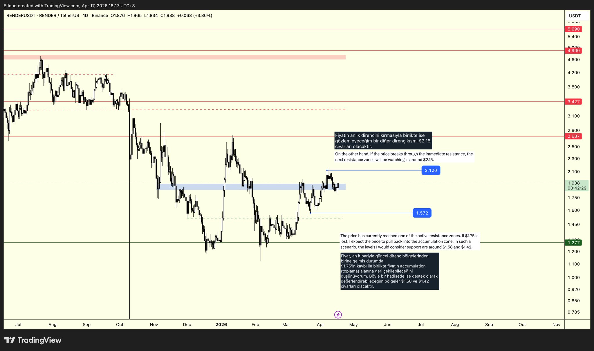 Efloud TA_Analyst Trader B179.75K @Efloud$RENDER | Update Greetings, You can see both English and Turkish notes on the chart. Additionally, if you would like to access the Turkish 🇹🇷 version of this analysis, please check the second post. Since I started this analysis in English, I will continue accordingly. What Has Happened Since the Previous Analysis: Following the $1.75 breakdown, the price tested the $1.58 support, where I took partial profit. However, the price resumed its climb without reaching my preferred support level $1.42 and my remaining position got stopped out above the blue box. This trade concluded with a minimal loss. I told that, with a close above the blue box, I expected the price to head toward $2.15. Unfortunately, the price reversed at $2.12 this time and did not reach my take-profit level. However, I am still holding my position. Current Thoughts: I consider the blue box as the current support zone and as long as it holds, I do not see a negative outlook for the price. I am looking to take a significant portion of my profit around $2.15. If the market turns negative, I will not consider any new entries until $1.42 support zone that I mentioned in the previous analysis. To avoid a repeat of what happened with my short position in the prior analysis, I am currently running a stop at entry. However, if I get stopped out, I will revisit the chart and attempt to re-enter on any potential bullish signals (confirmations) around $1.893. As I said, I do not have a bearish outlook unless the blue box is lost. Wishing everyone a wonderful weekend ahead.