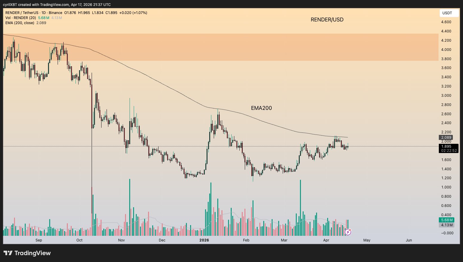 Cyril-DeFi TA_Analyst Trader C141.61K @cyrilXBT$RENDER is a completely different story. - 200 EMA is still trending down at $2.08. - Massive resistance zone sitting between $3.80 and $4.40. - Price has not been able to break above $2 with any conviction. Not interested yet. I need to see a clean reclaim of the 200 EMA before this gets on my radar.
