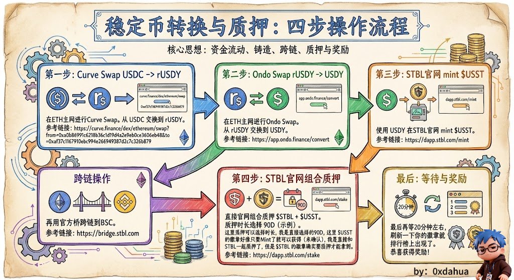 BuTongRen 🧠SENT D10.07K @BuTongRen6STBL mouth‑talk rules changed, adding MSF staking + Mint USST @stbl_official, after distributing the first month’s rewards, introduced a new algorithm that directly affects your MindShare. That means you now need to participate in staking $STBL and holding $USST. These are the two badges already on the leaderboard; there’s no minimum amount requirement for the badges—just participation (though the amount will of course influence the algorithm’s weighting). // Step 1: First on Curve Swap USDC - rUSDY on the Ethereum mainnet (https://t.co/tC6rzS0uiv) Step 2: Ondo Swap rUSDY - USDY on the Ethereum mainnet (https://t.co/QCHB3TtW9M) Step 3: On the STBL website, use USDY to mint $USST (https://t.co/4JwaUr0cna) Then use the official bridge to cross‑chain to BSC (https://t.co/3srWsvPl6R) Step 4: Directly on the website, stake $STBL + $USST together (https://t.co/VbDz7ht4fw) For staking you can choose the duration; I chose 90D directly. It seems the $USST badge is granted as soon as you mint it (unconfirmed). I staked it together with STBL, but the $STBL badge does require staking to obtain. Finally, wait about 20 minutes, refresh, and your badge will appear on the leaderboard.