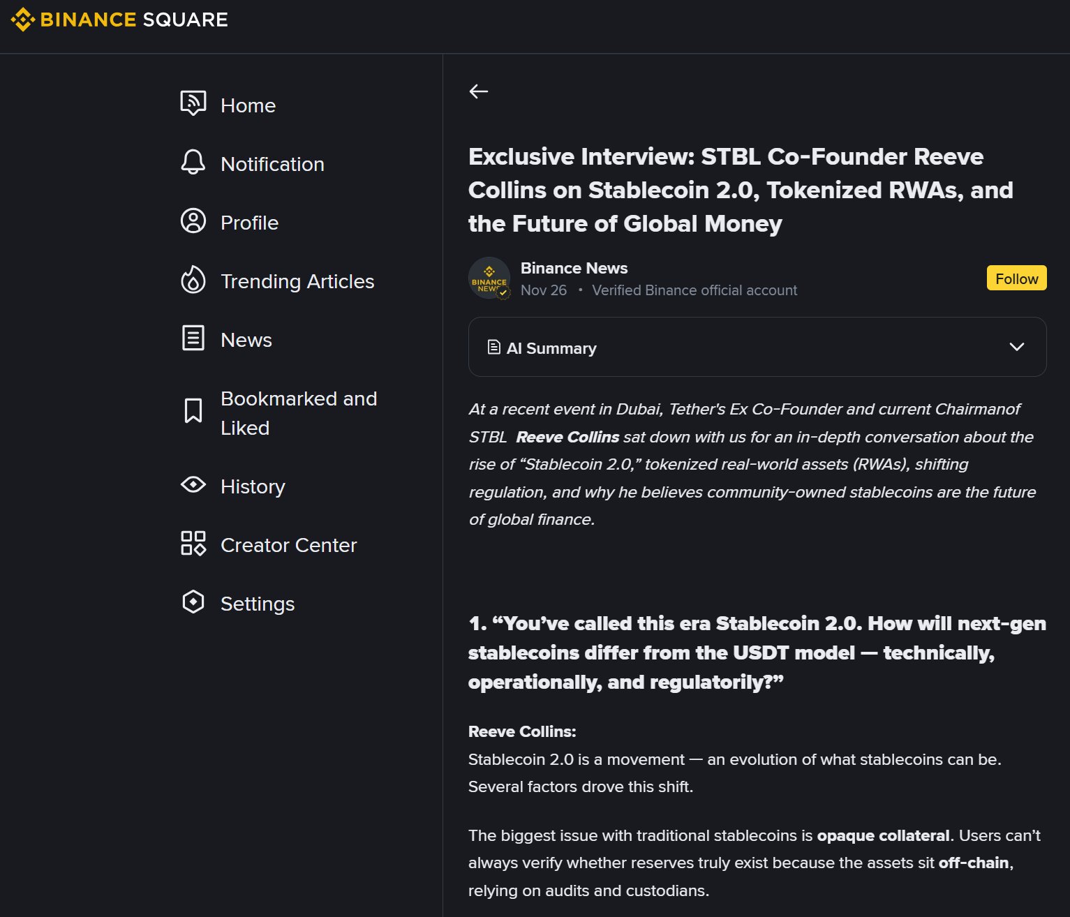 Shuarix™ Researcher Influencer B41.95K @ShuarixI just listened to Reeve Collins break down “ @stbl_official 2.0,” and hearing it directly from him really puts the whole shift into perspective He made it clear that the old model (opaque collateral and issuers taking all the yield) is on its way out What’s coming next? Fully on-chain collateral, where everything is visible in real time, and a structure where the community earns the yield instead of a centralized company Tokenized treasuries, RWAs, and transparent vaults aren’t just buzzwords anymore, they’re the foundation of the next generation of stablecoins What really stood out is how regulation isn’t a blocker anymore According to Reeve, clarity in the U.S., Europe, and the UAE is actually accelerating institutional adoption Banks and funds finally know the rules, so they’re ready to step in And yes, he confirmed that an AED-backed stablecoin is coming within the next 12 months, with more region-specific and RWA-backed models on the way If what he’s saying plays out, user-owned, fully transparent stablecoins are going to reshape global finance a lot faster than most people think $STBL is the way