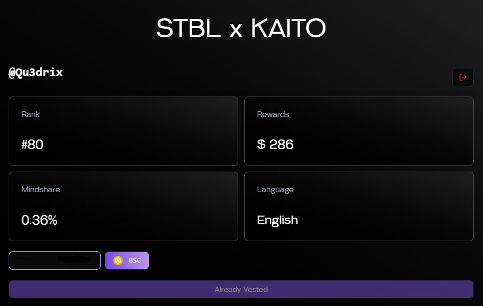 Quadrix Researcher Educator A3.13K @Qu3drixafter yesterday's sentiment being bullish, team decided to make us even more bullish monthly stbl kaito rewards have been given to the community and you can also start the vesting right away finished on the #80 place, not bad but not my target I would tell that it's acceptable #80 place= $286 in $STBL vested ngl at the first look you might tell that it's too small yea, I agree, but... remember that stbl it's standing at around 30m marketcap the ath was almost 300m so we don't know where it will stand in a few months that's why I've been talking about it and had everyone tired of it r/r on it looks great as the content creators have nothing to lose at all they've just been helping the project getting visibility x's will be done but if you were also present in the dca team, then... congrats to you coming back at this tweet at the next @stbl_official reward day