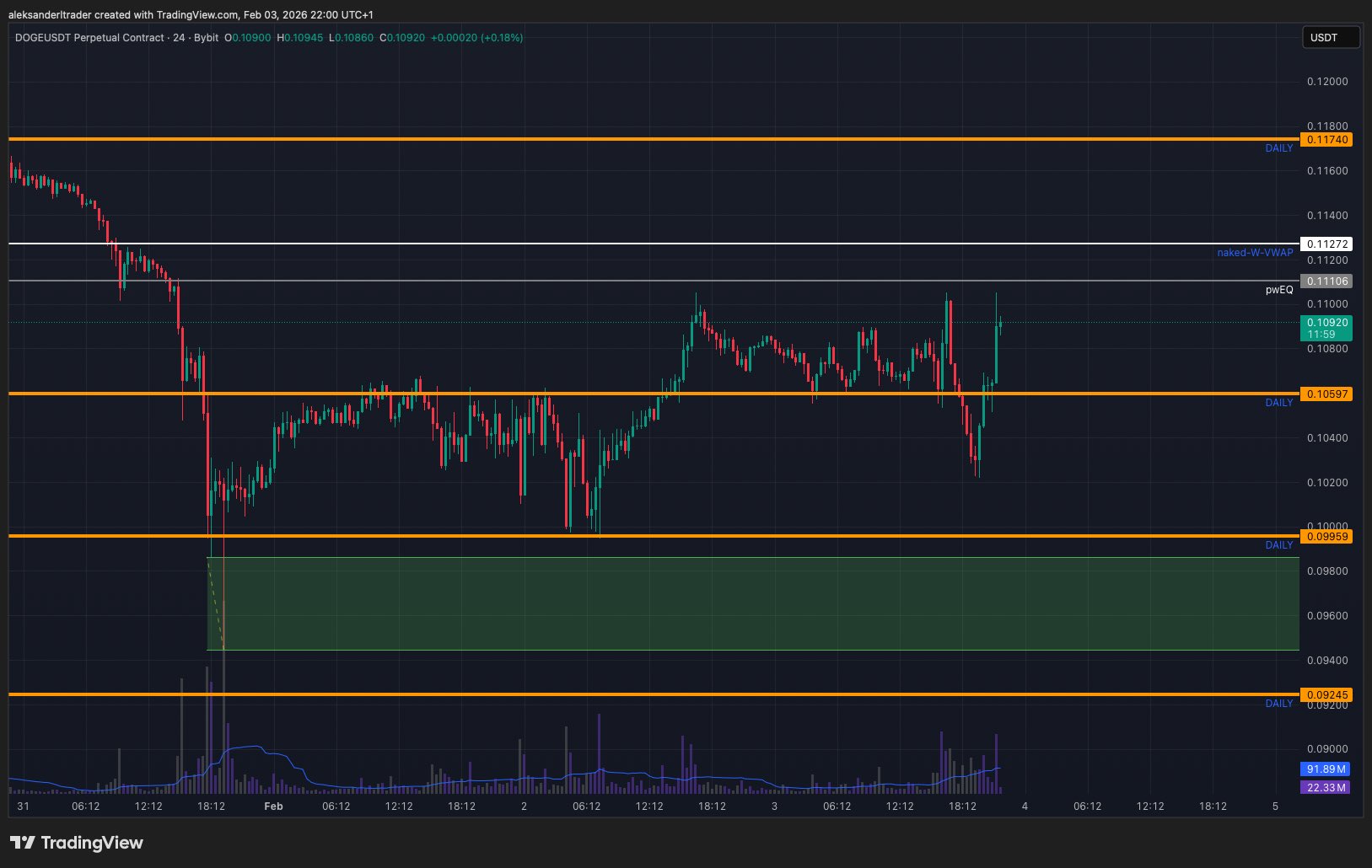 DOGE quickly reclaimed after a fake breakdown on the daily chart; key support at 0.106 must hold.