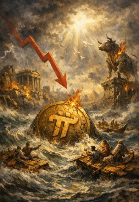 AI image depicts the crypto market and Pi coin facing collapse, with a red arrow indicating a price plunge and the bull market's demise.