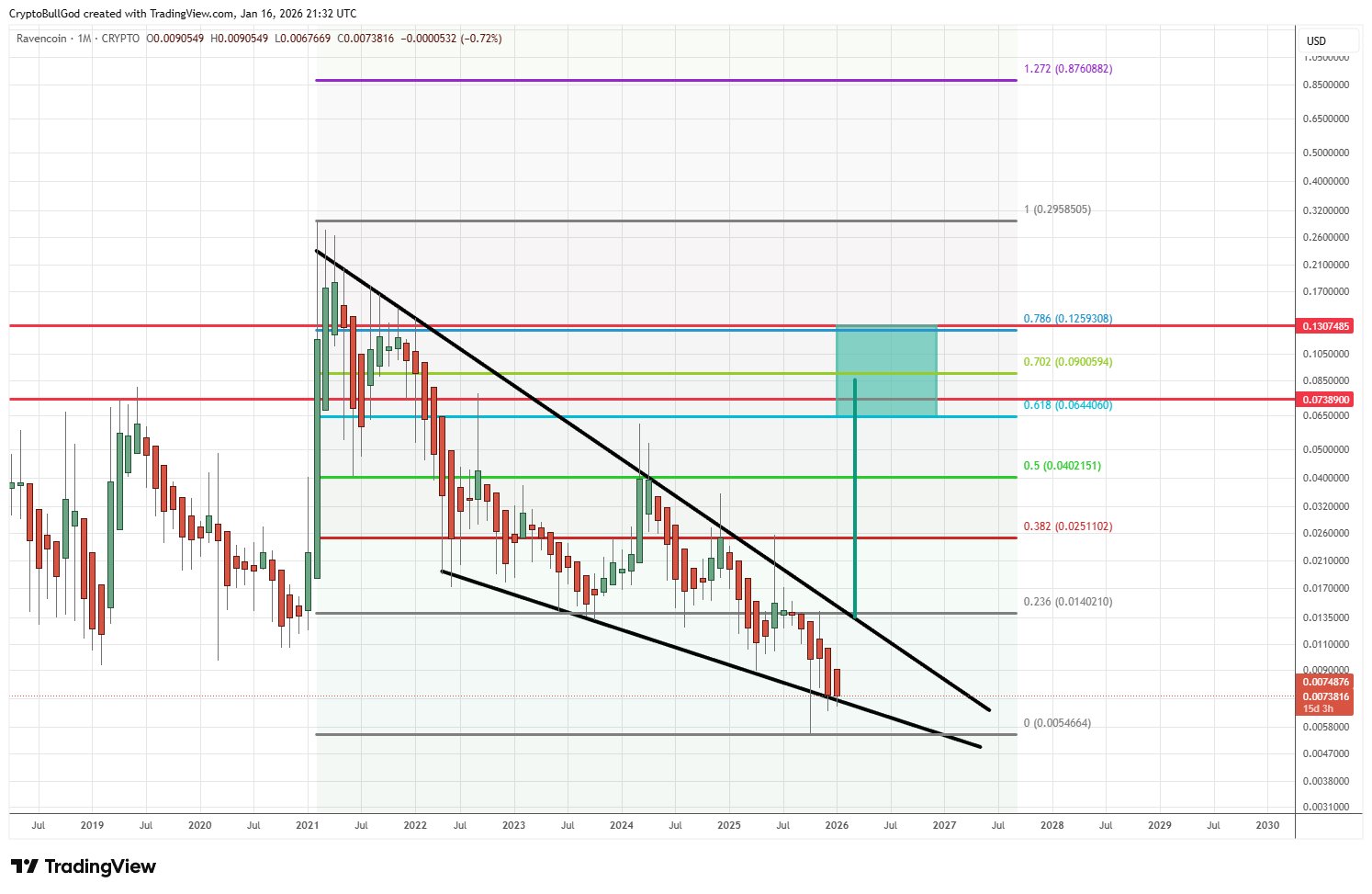 RVN is at the end of a multi-year falling wedge, and technical analysis predicts a target price of about $0.09 after a breakout.