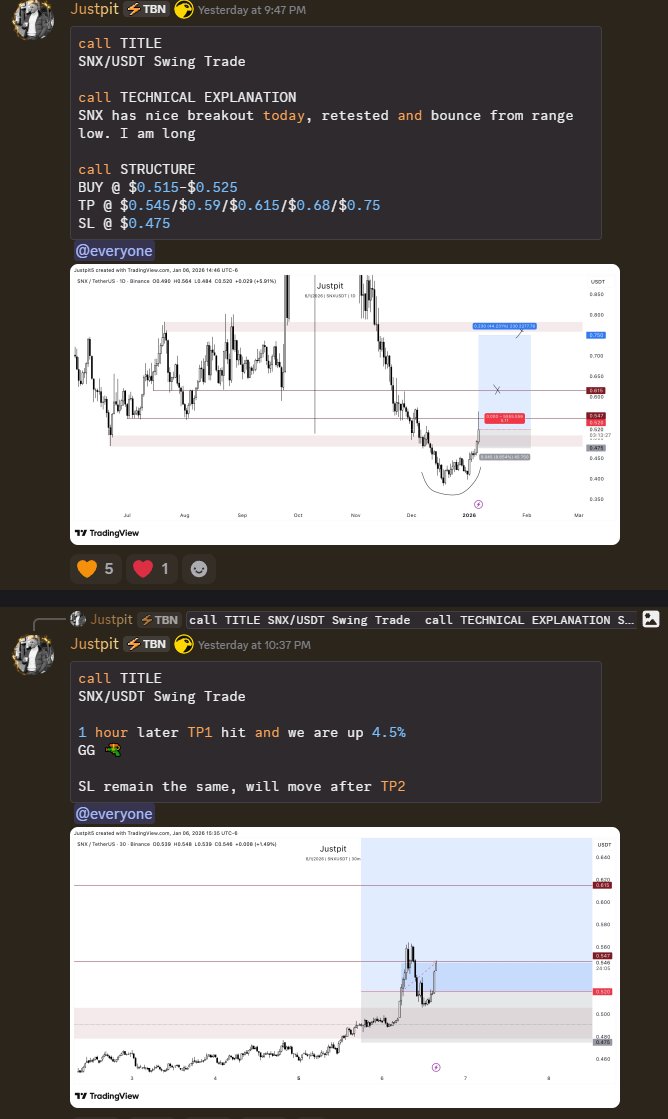 SNX broke out and successfully hit TP1, earning 4.5%.