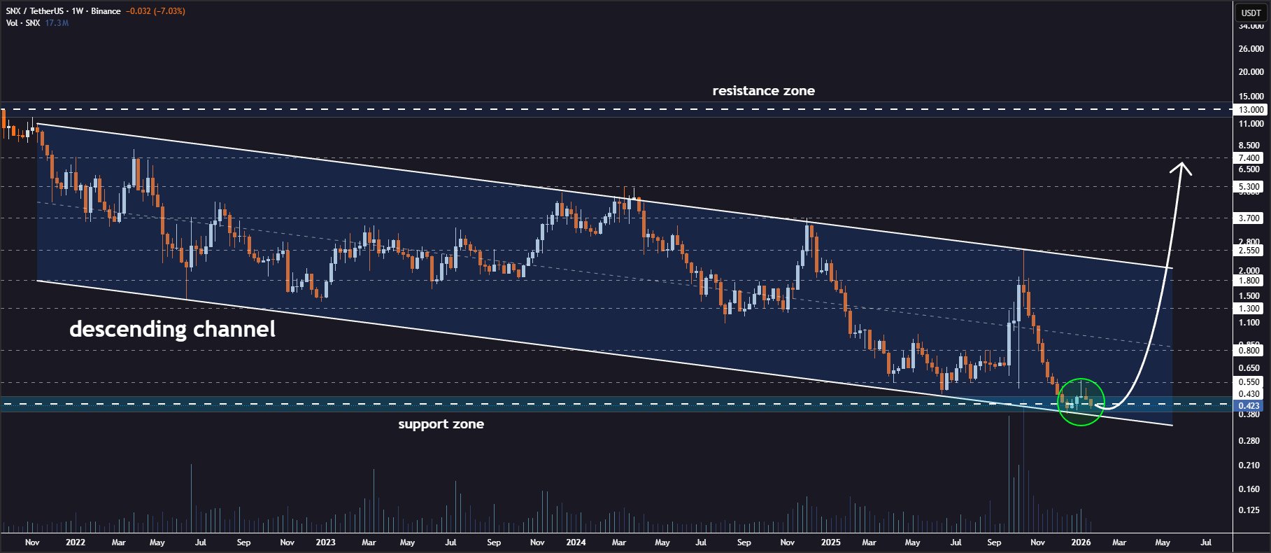 Synthetix is testing the lower border of the descending channel pattern on the weekly time frame👨‍💻