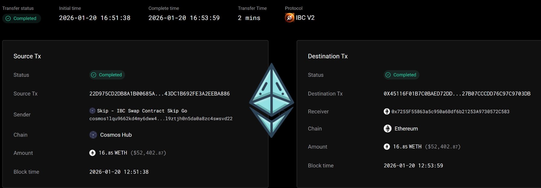 上周最大IBC跨链转账,16.85 WETH从Cosmos Hub转至以太坊L1。