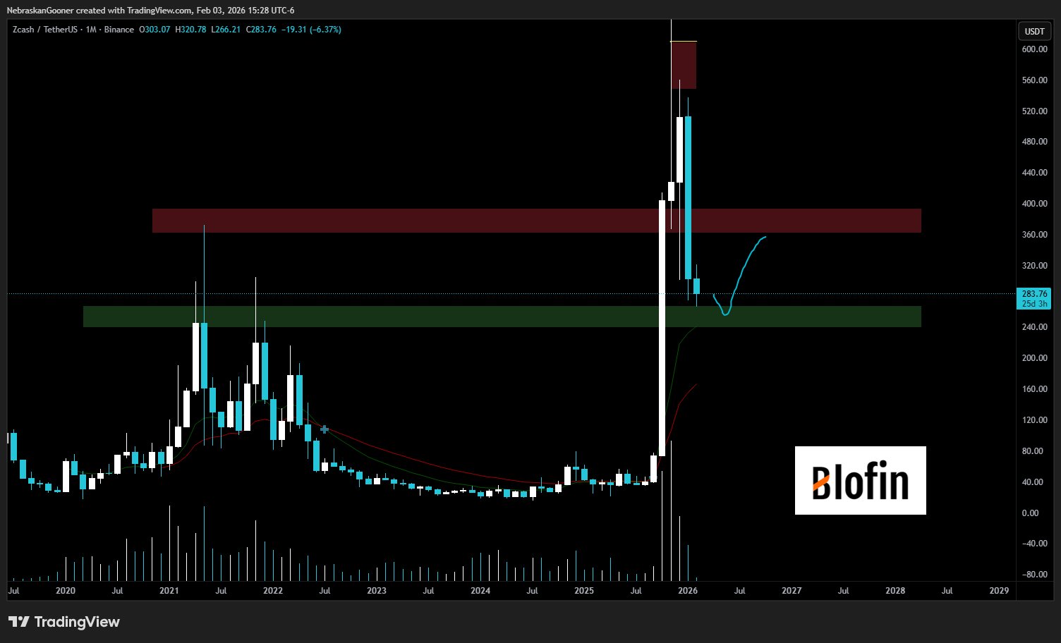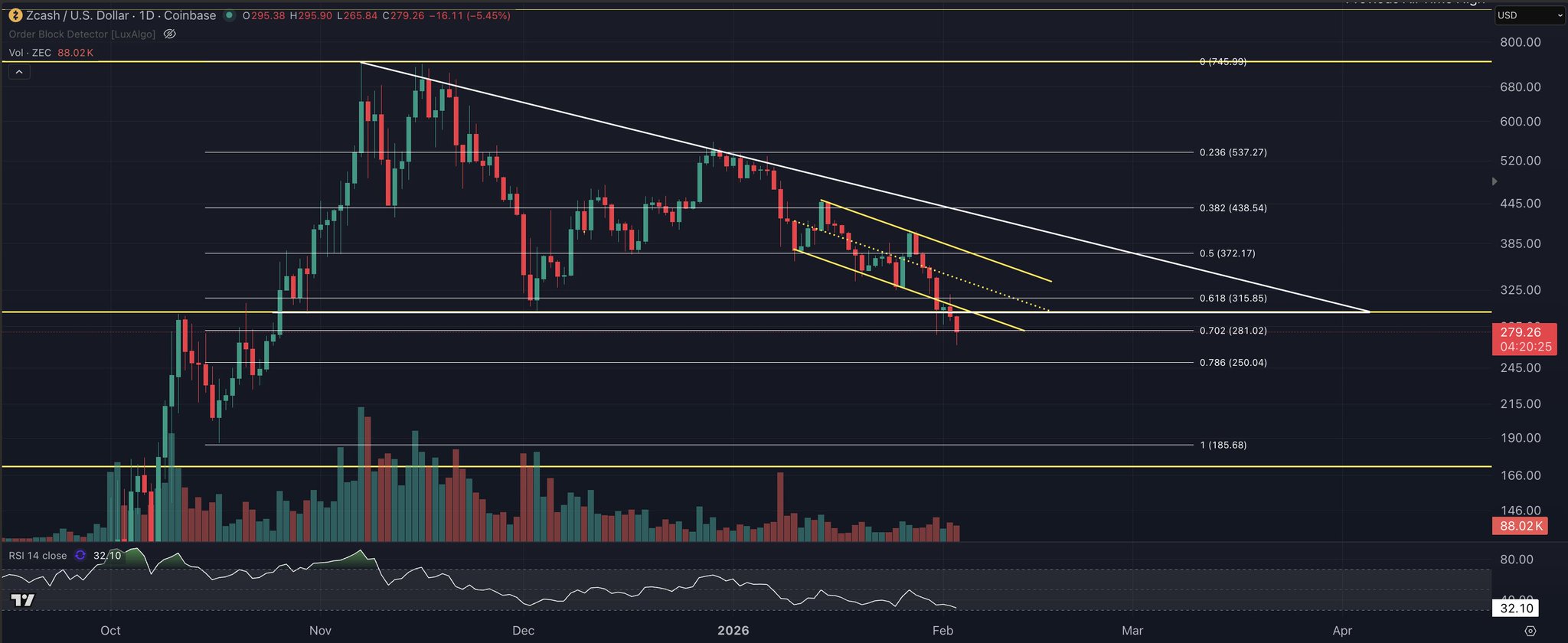 #ZEC fell just past the .702 fib level and retracted back when Bitcoin retracted. There's still the possibility of price hitting $250 at the .786. I'll reevaluate at that point if it gets down there. https://t.co/zzobeLYXU7