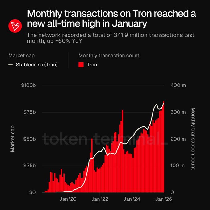 Hồng Ngọc | Ruby💎 DeFi_Expert Influencer B18.01K @hongngo38104169TRON continues to demonstrate strong on-chain momentum as network activity reaches new milestones. Recent data shared by Token Terminal shows that the TRON DAO ecosystem recorded 341.9 million transactions in January, marking a new all-time high and reflecting approximately 60% year-over-year growth. This surge in activity highlights TRON’s expanding role as a high-throughput settlement layer for stablecoins, DeFi, and global payments. 1️⃣ Record-Breaking Network Activity → Monthly transactions climbed to historic levels, signaling sustained growth in real-world usage. → Rising wallet activity suggests increasing adoption across retail users, fintech integrations, and payment applications. 2️⃣ Stablecoin & Payment Dominance → TRON remains one of the primary settlement networks for stablecoin transfers worldwide. → High-speed and low-cost transactions make it ideal for remittances, trading flows, and cross-border payments. 3️⃣ Infrastructure Built for Scale → The network continues to handle increasing throughput without congestion or rising fees. → This reliability strengthens TRON’s position as a foundational layer for DeFi platforms and financial services. Beyond raw numbers, the trend reflects a deeper shift: blockchain adoption is moving from speculation toward everyday utility. As stablecoin usage expands and on-chain finance becomes more integrated with traditional systems, networks capable of delivering efficiency at scale will define the next stage of Web3 growth. With transaction volume accelerating and ecosystem demand rising, TRON’s trajectory points toward continued expansion as a global settlement and liquidity backbone for digital assets. @trondao @justinsuntron #TRONEcoStar
