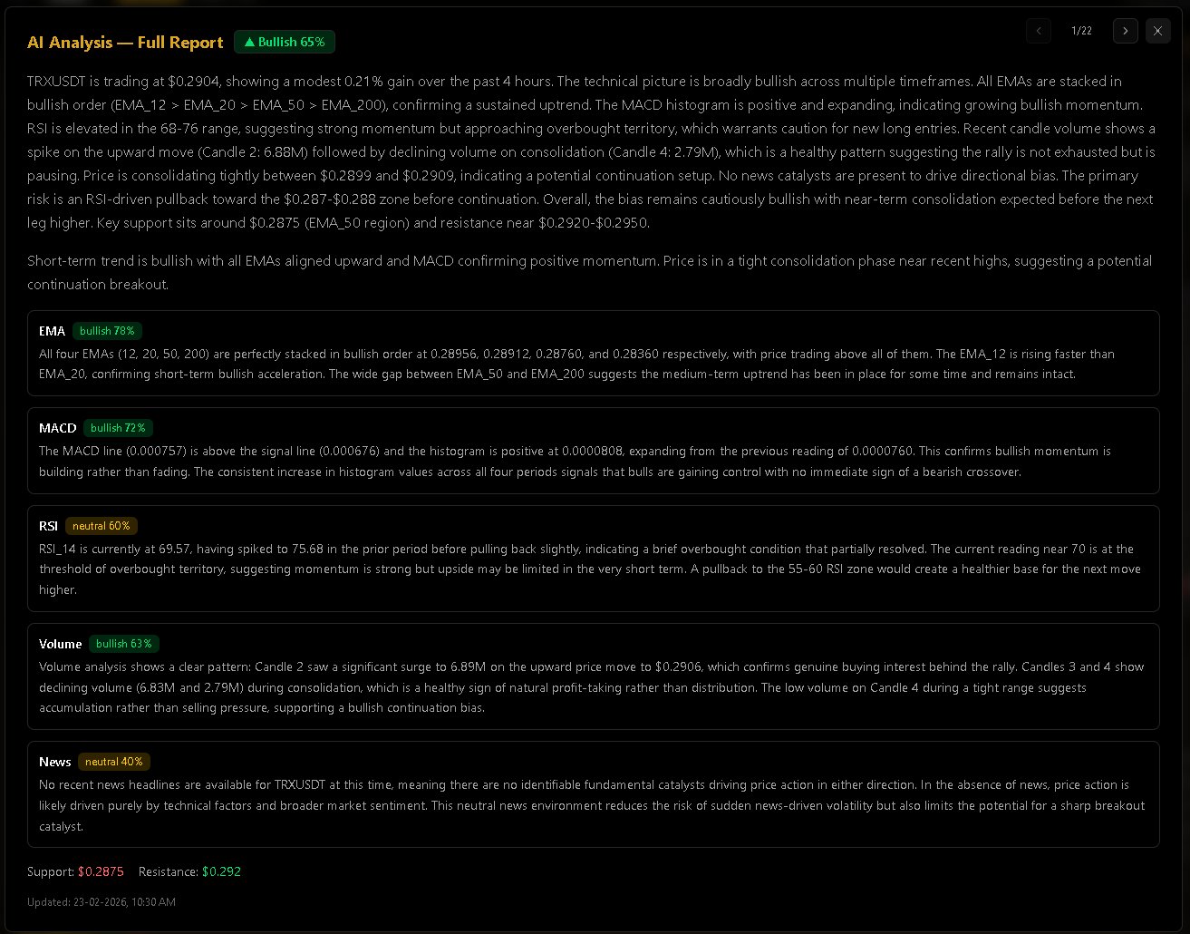 Vincent Van Code Dev FA_Analyst S45.57K @vincent_vancode🚨 TRX showing 65% Bullish sentiment using https://t.co/eXdM618Azb analysis. This is the only token I am tracking that is bullish, in a clearly bearish huge dump. Of course this is NOT FINANCIAL advice, but i am watching TRX to see how it behaves. It has dumped with the market, but the fundamentals/TA showing that it will likely bounce back in the next 4-48 hours. Again, not a trading signal, just interesting to learn how the AI can interpret these things. Note https://t.co/eXdM618Azb will be launching soon.