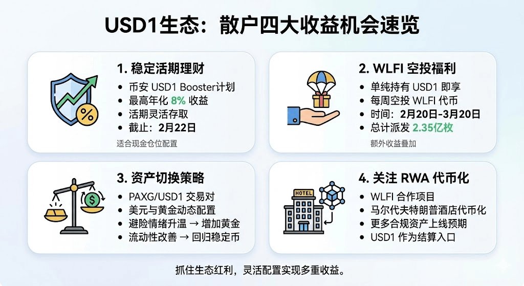 Binance launched the USD1 Booster program, offering a cash‑like product with up to 8% annual yield, valid through February 22. In low‑volatility environments, it serves as a suitable tool for cash‑position allocation.