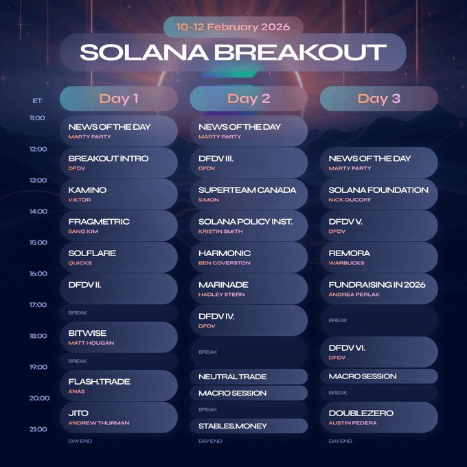 The Solana ecosystem's "Solana Breakout" event will be held from Feb 10-12, focusing on project development.