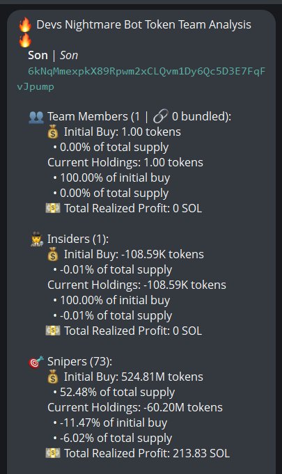 $Son (CA 6kNqMmexpkX89Rpwm2xCLQvm1Dy6Qc5D3E7FqFvJpump) doesn't have snipers and insiders per devsnightmare. emroonz, wrld_sol, meehan, bropump.sol, Tully are top holders.