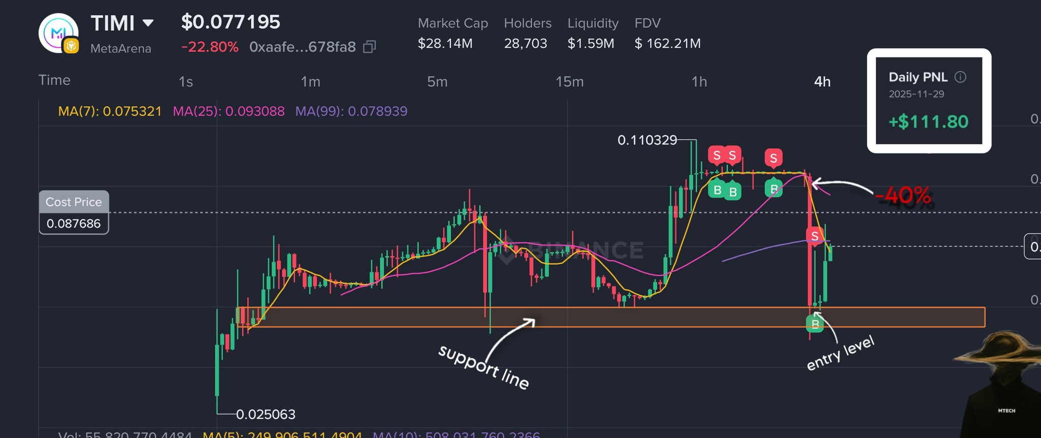 The author bought at the support after TIMI crashed and profited, emphasizing basic trading techniques.