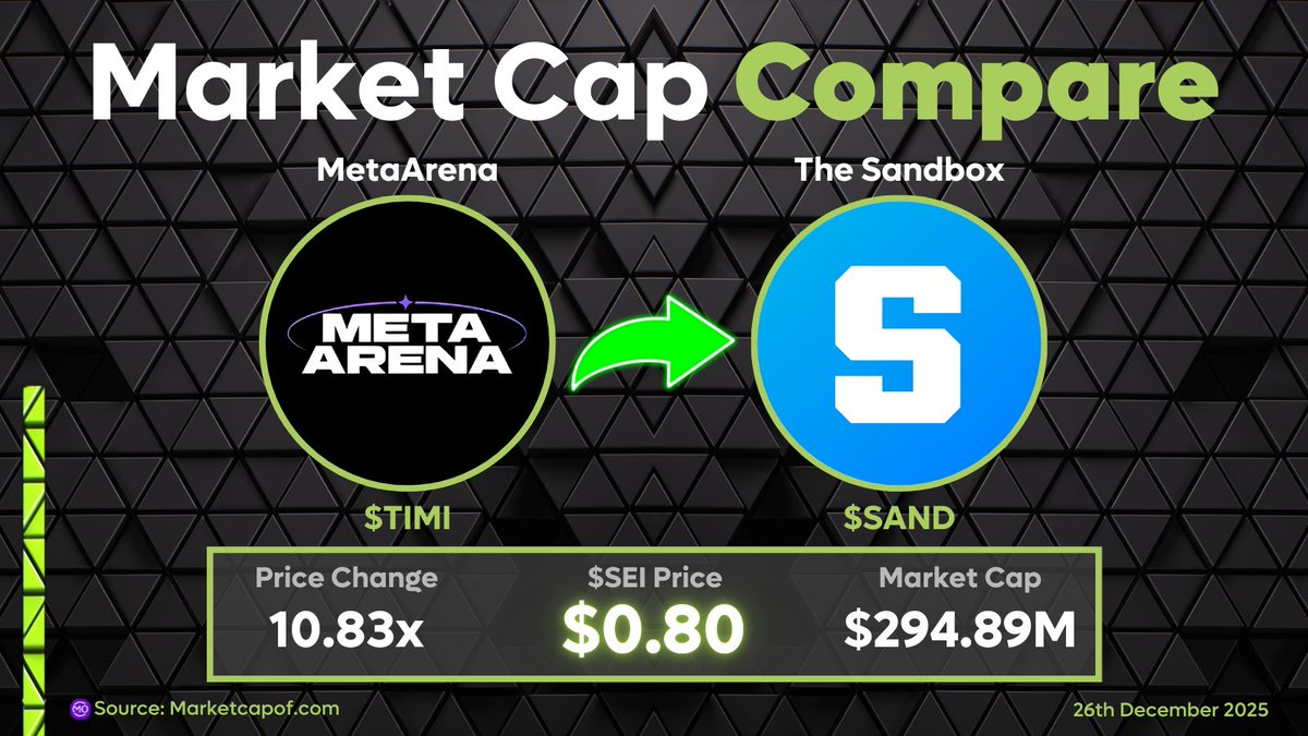The tweet is bullish on MetaArena ($TIMI), expecting its market cap to surpass The Sandbox ($SAND) before 2026, showing TIMI has a 10.83x growth potential.