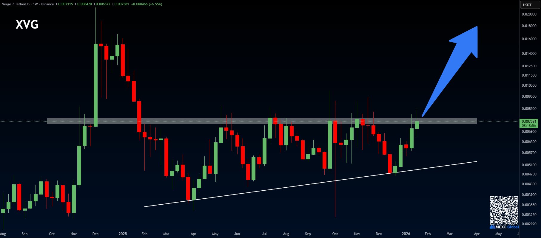 XVG breaks out of an ascending triangle on the weekly chart, signaling a strong upward trend.