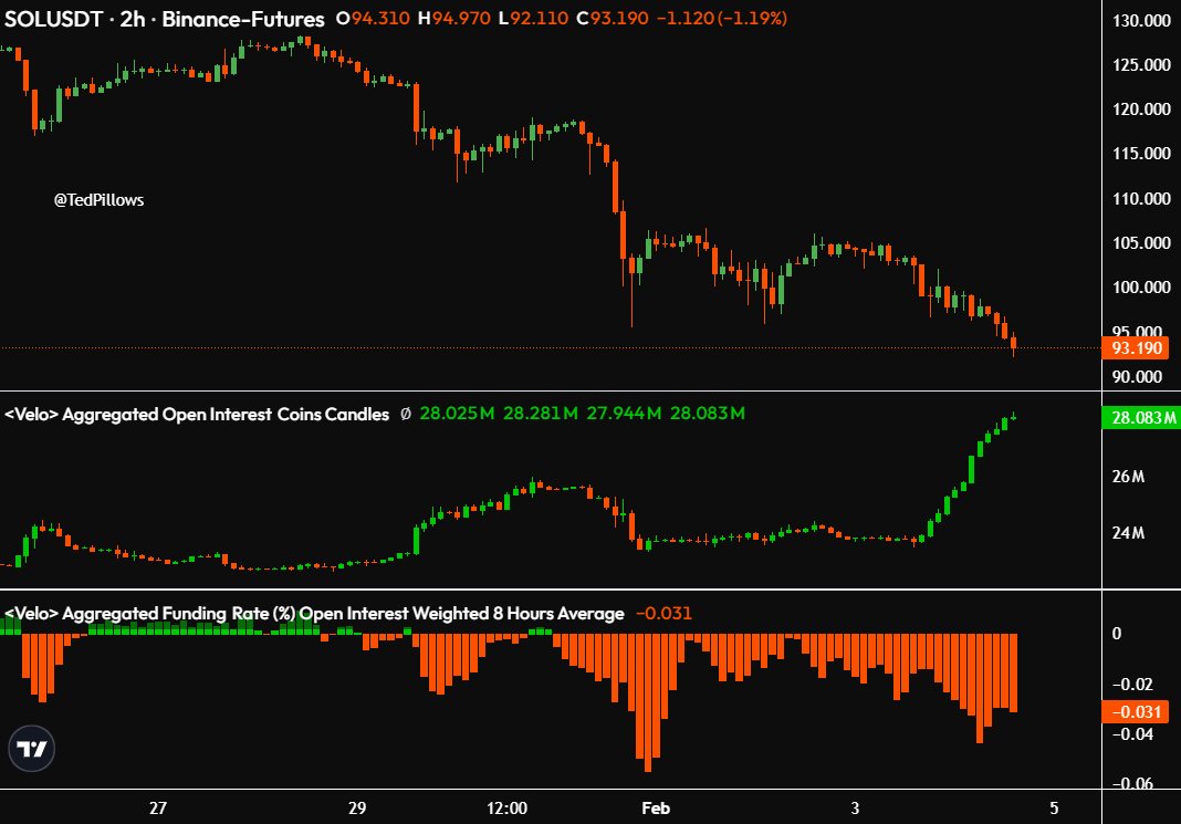 SOL price is falling, OI is increasing, funding rate is negative, and it is being heavily shorted.