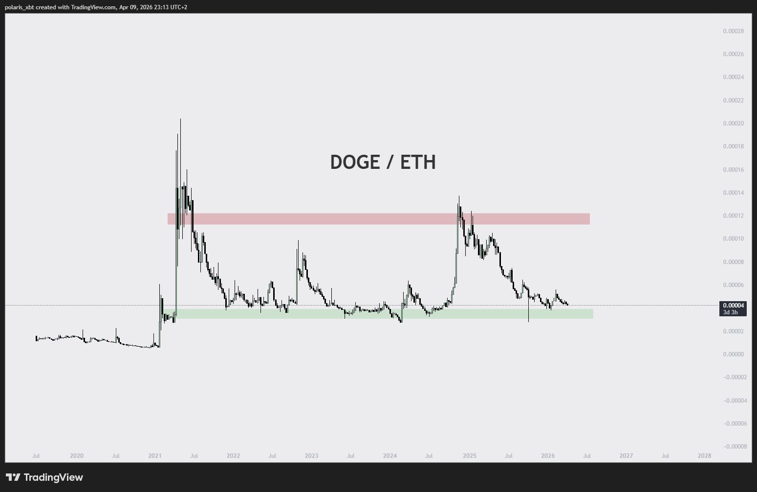 DOGE/ETH exchange rate has fallen to the long-term support level, and the author believes it has long-term allocation value.