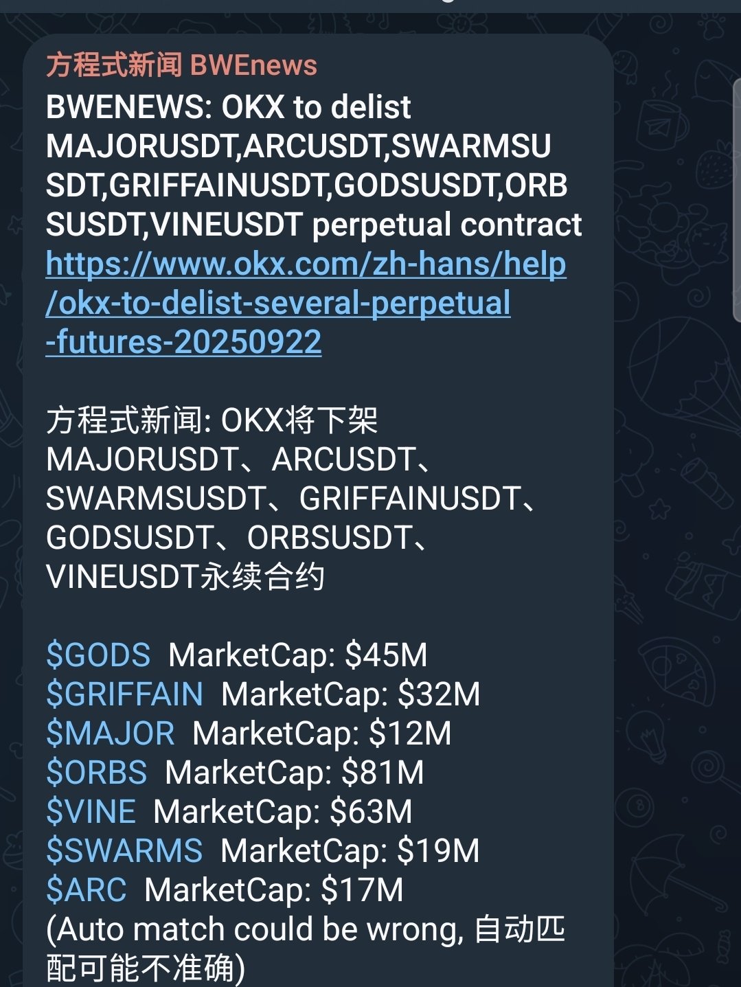 OKX will delist seven perpetual contracts, including MAJOR. The tweet warns investors about the risk of exchanges frequently delisting tokens.