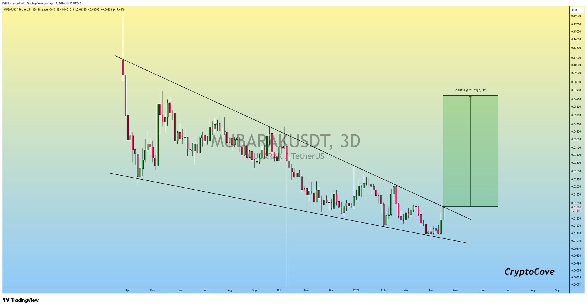 MUBARAK is expected to surge strongly, suggesting to accumulate and hold after a wedge breakout, with a target increase of over 300%.