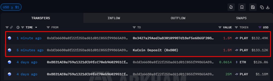 PLAY token transferred from project wallet to exchanges, warning of potential sell-off risk.